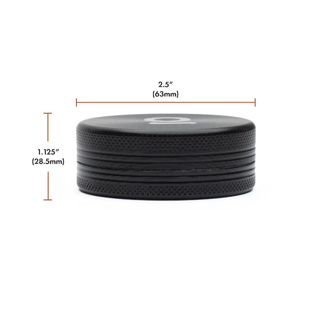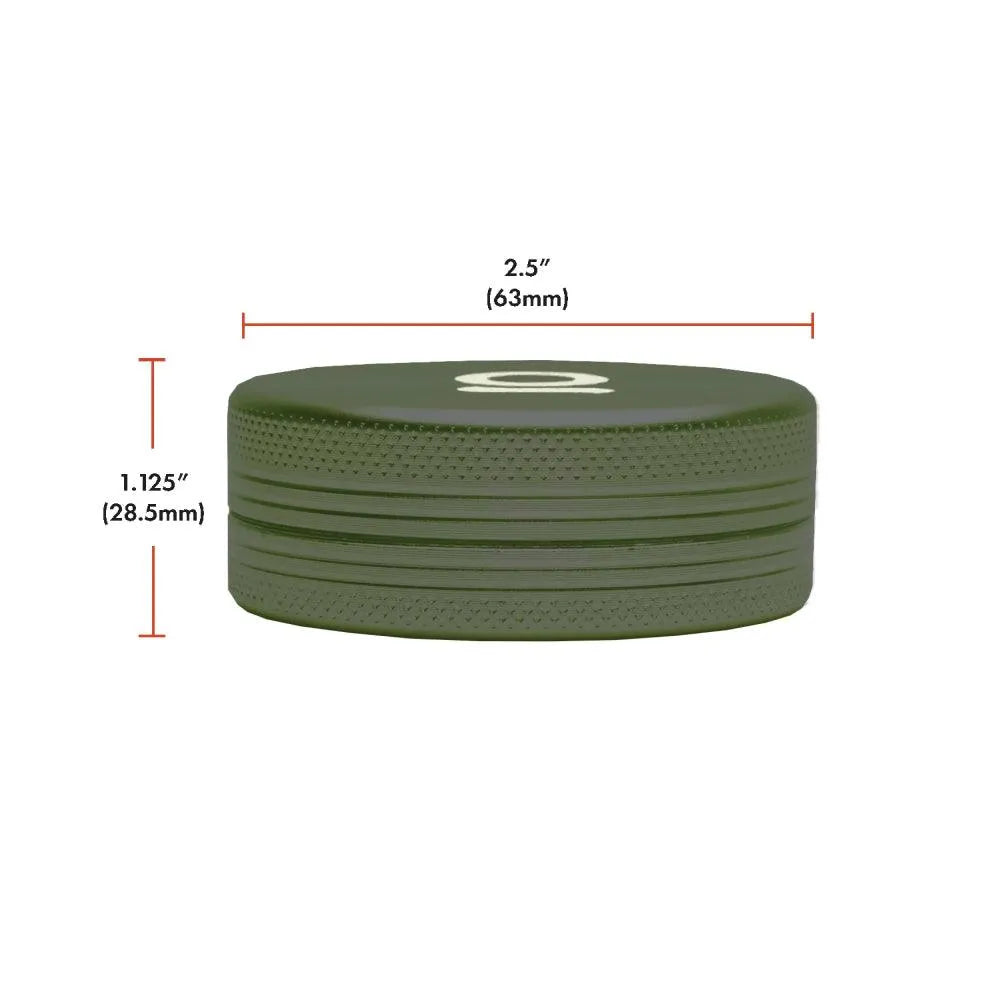 This herb and spice grinder has a diameter of 63mm, making a good size to be portable, and large enough to fit a small/mini humidity pack in the bottom chamber for long term storage.