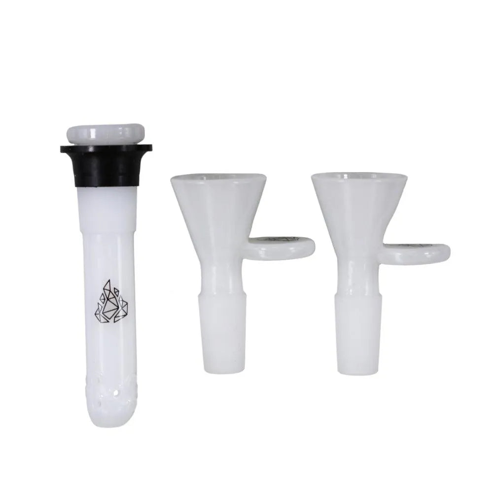 Pure glass accessories, crafted for your enjoyment. Each glass set comes with two glass bowls, and one glass stem for use with your BRNT Hexagon ceramic water pipe.
