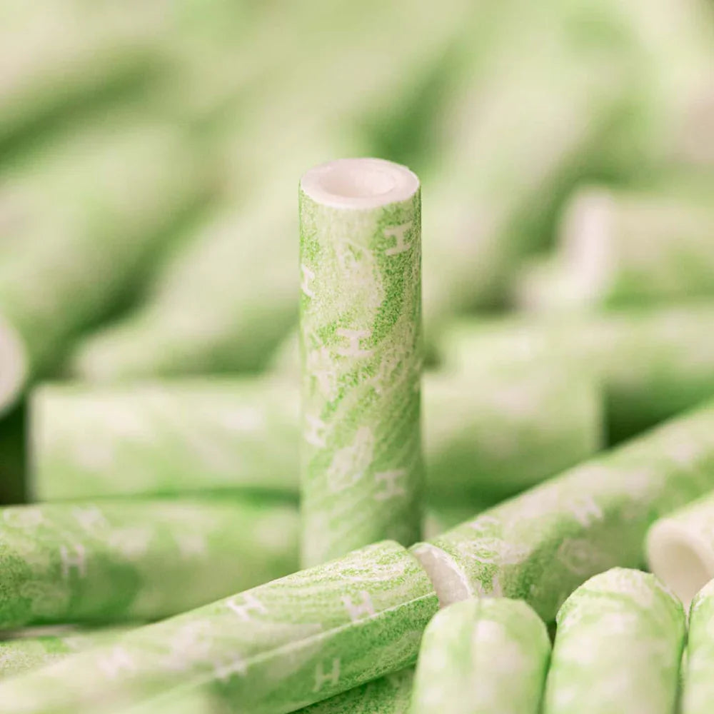 Each filter uses a 4-layer hybrid build combining activated carbon and cellulose to help trap fine particles while keeping resistance low. The crisp green shell features an irregular smoke-style pattern, so every tip looks slightly different and stays easy to spot in your kit.