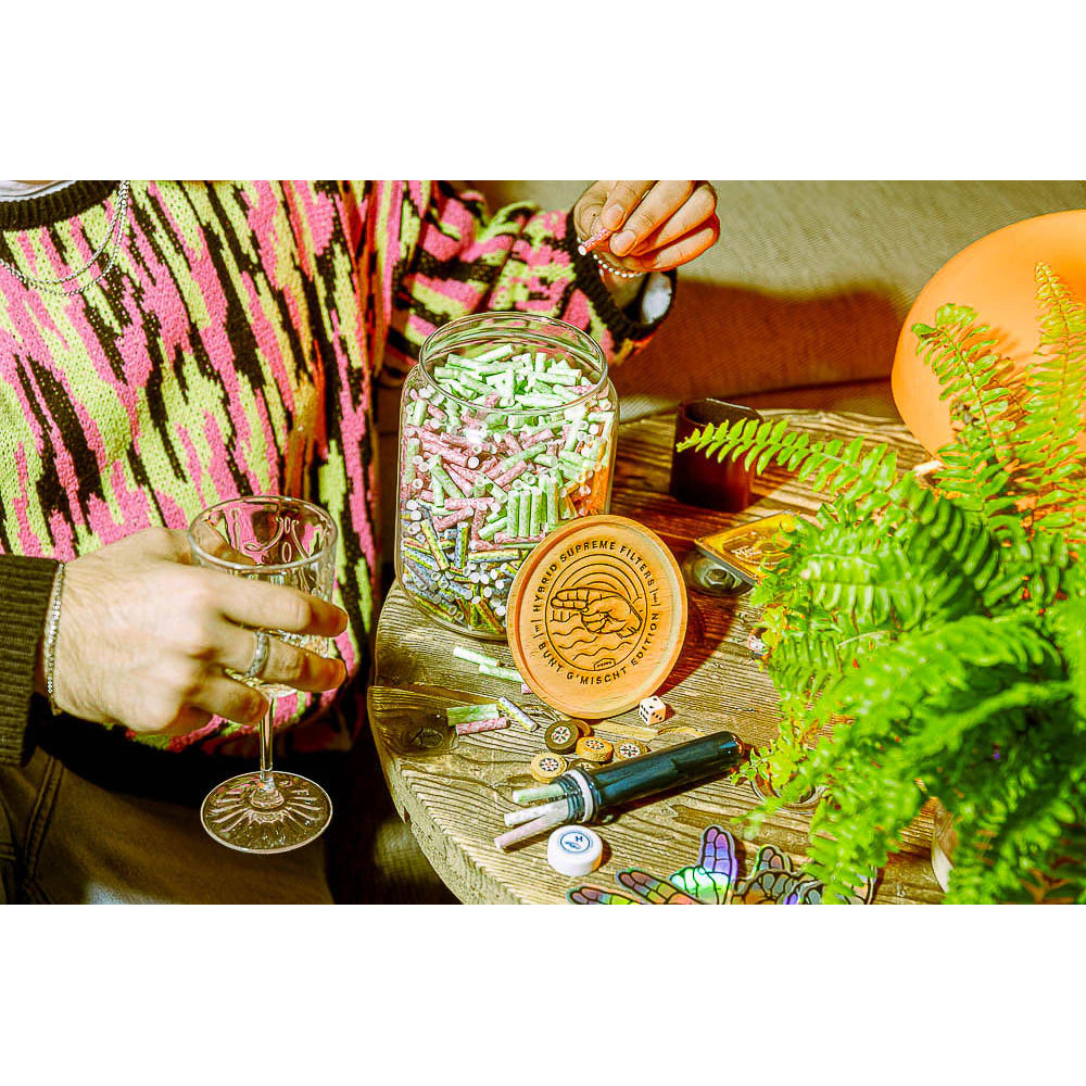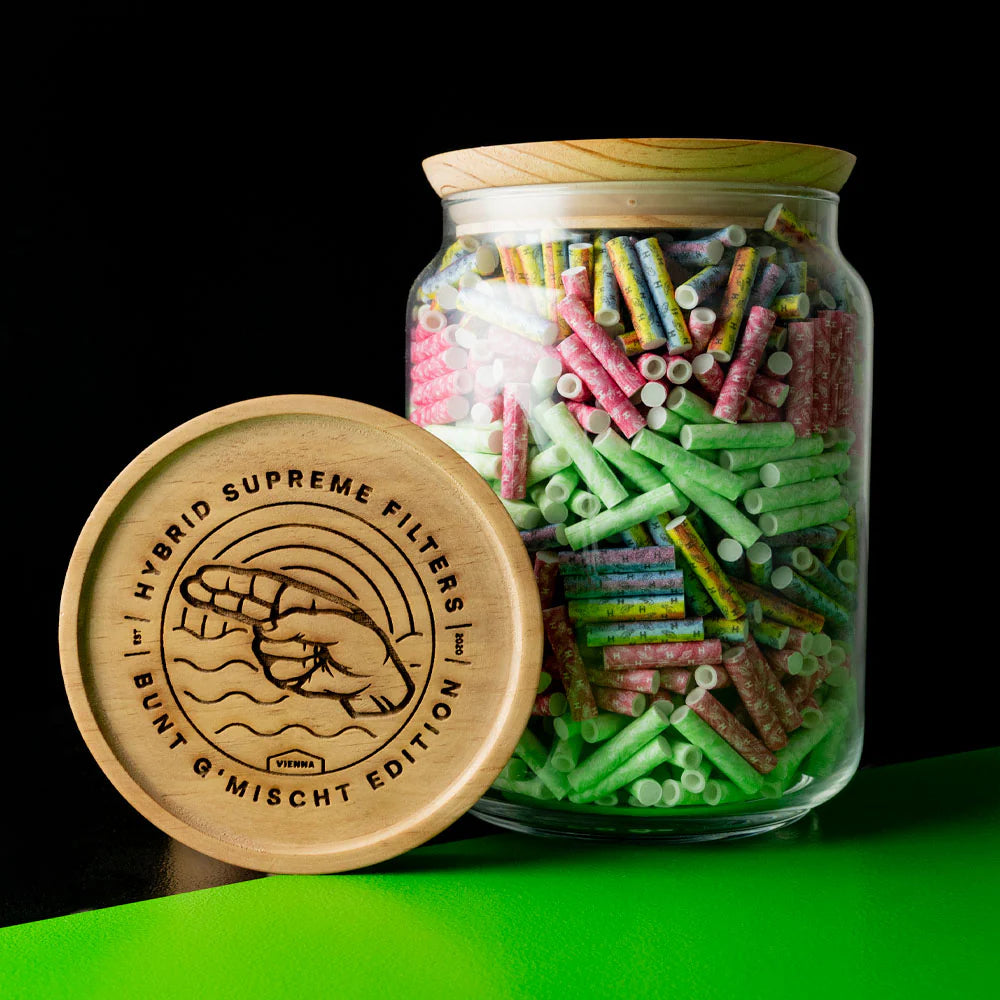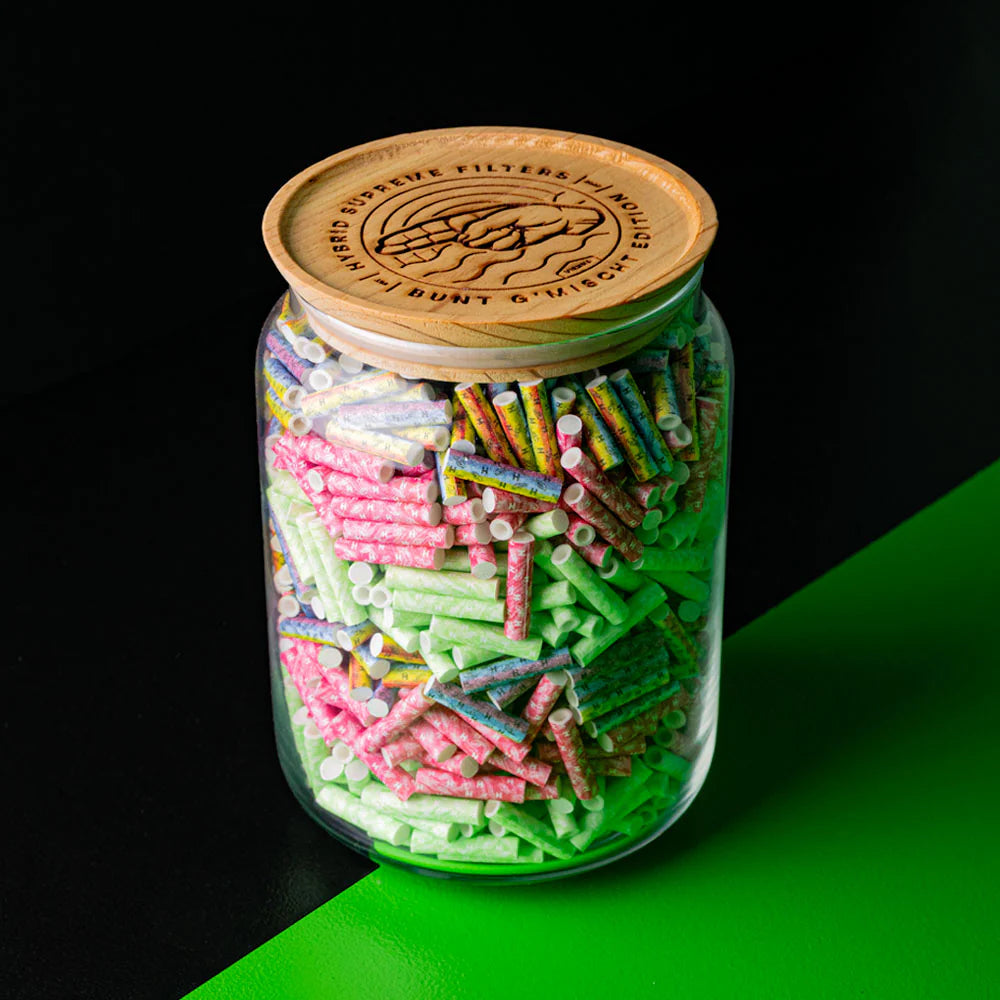Bring color and consistency to your roll-your-own routine. The Hybrid Supreme Filters Glass 1000 Bunt G'mischt includes 1,000 activated carbon filters in a premium glass jar. Hybrid Supreme Filters designed it for smokers who want smoother draws, clean handling, and a setup that looks great on the shelf.