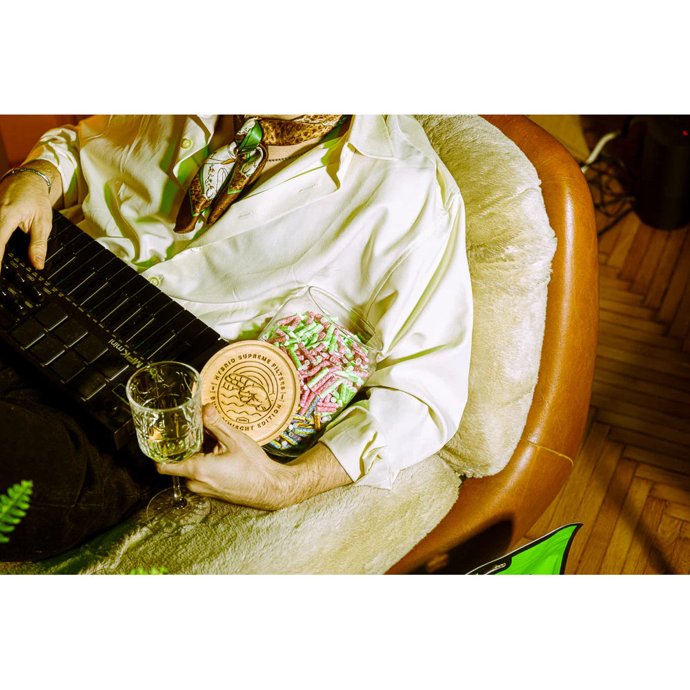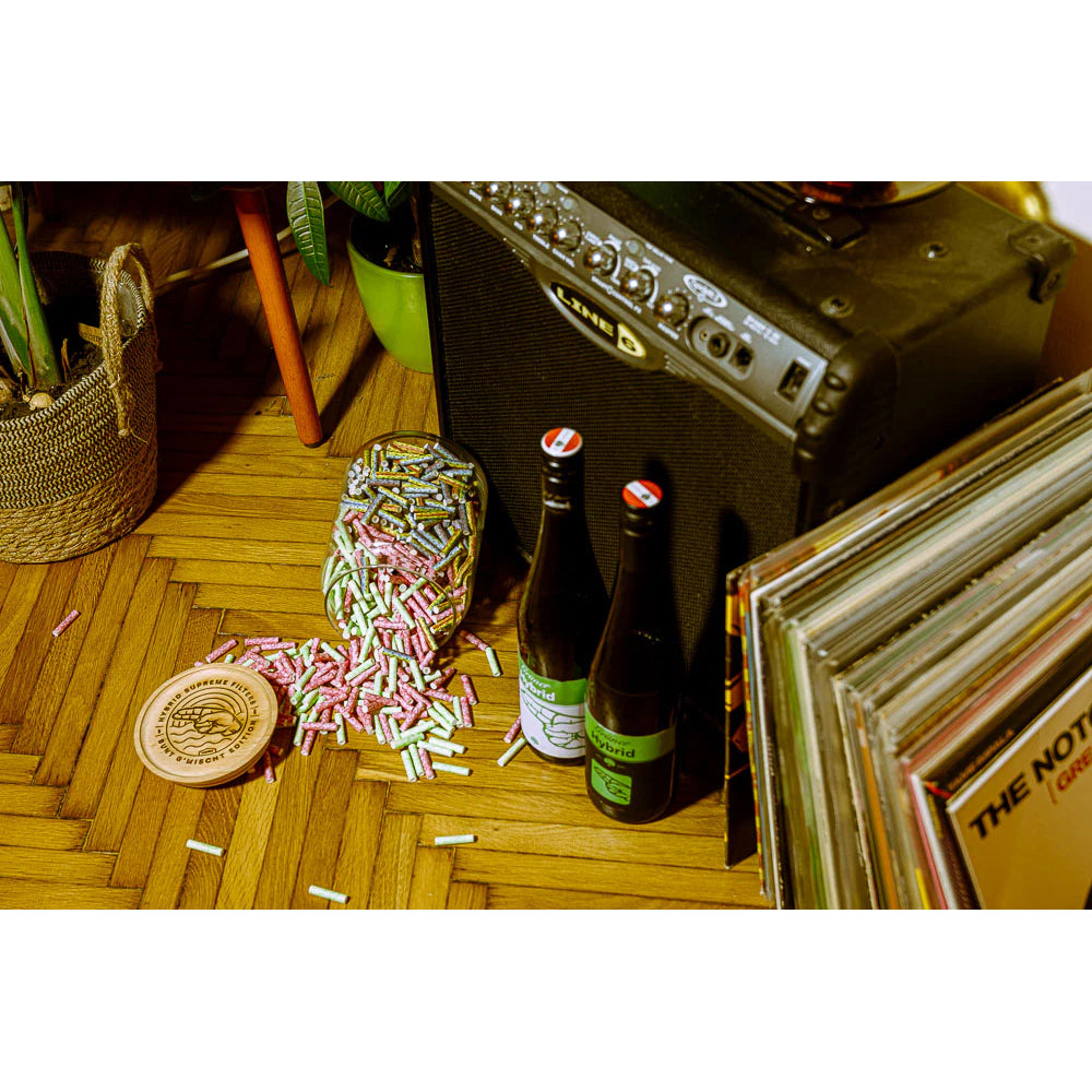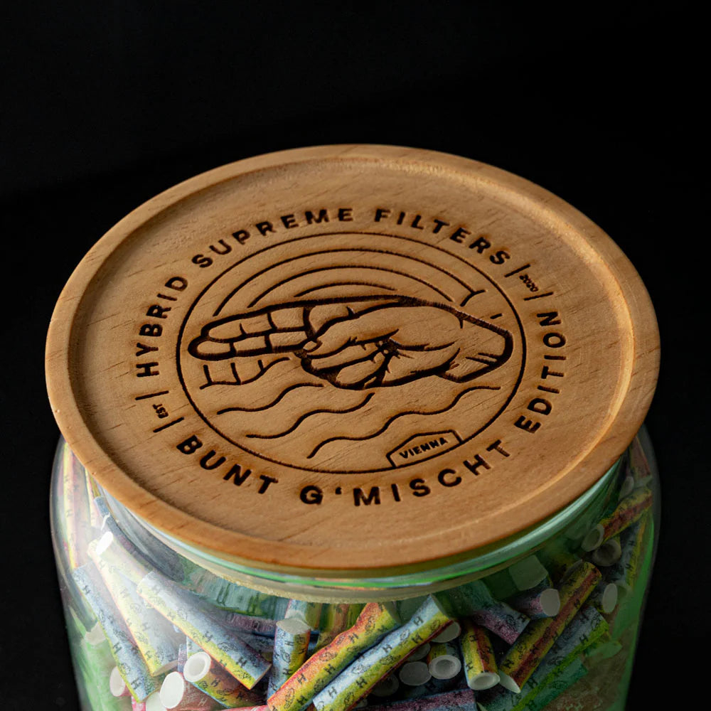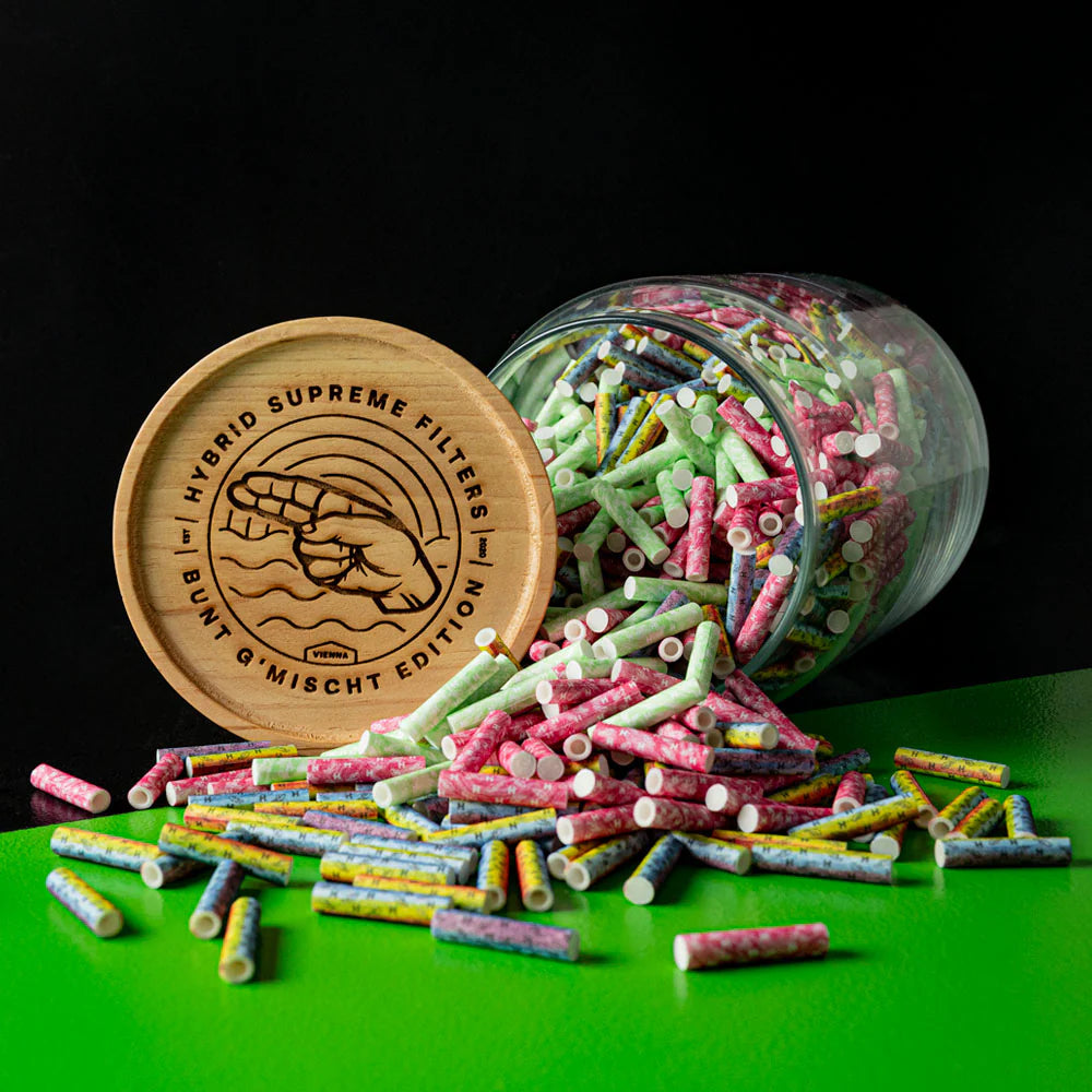Bring color and consistency to your roll-your-own routine. The Hybrid Supreme Filters Glass 1000 Bunt G'mischt includes 1,000 activated carbon filters in a premium glass jar. Hybrid Supreme Filters designed it for smokers who want smoother draws, clean handling, and a setup that looks great on the shelf.