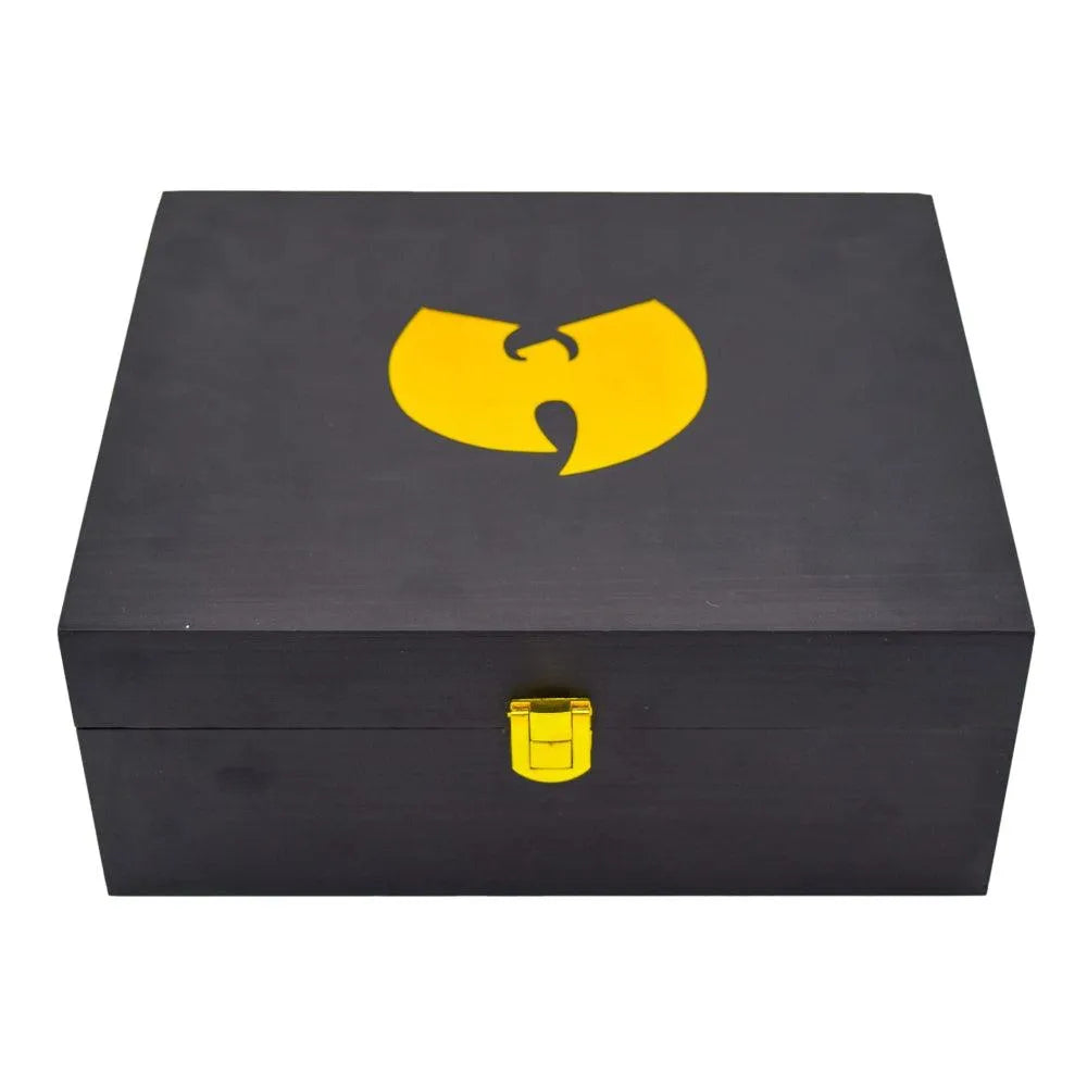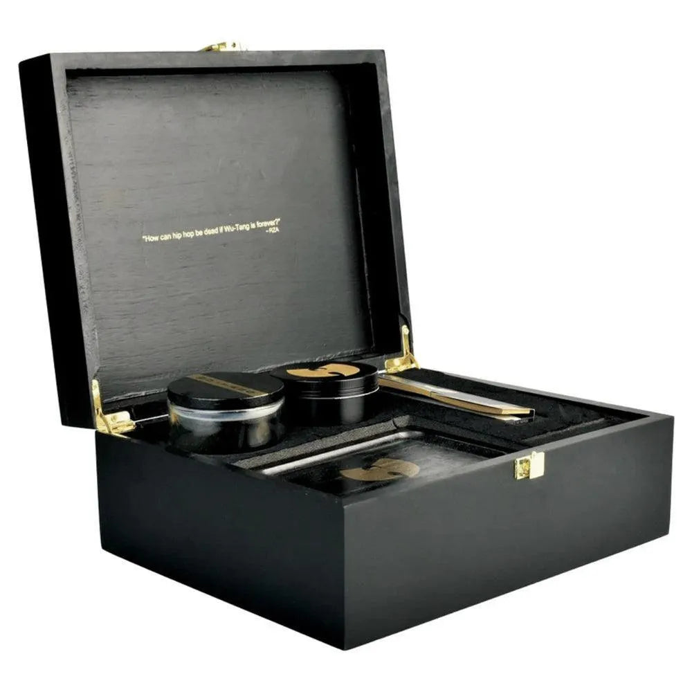 With an entourage almost as big as the Wu-Tang Clan itself, the Wu-Tang Deluxe Smokers Set has all the crucial smoking accessories one could need, just short of a lighter and the herb itself. This kit comes in a classy, hinged wooden stash box with a black finish and the classic gold Wu Tang symbol. Included is a 7" by 5" (17.8 x 12.7 cm) rolling tray, a pack of king size slim rolling papers with tips, a pop-top storage jar and a 2.5" (6.35 cm) metal herb grinder.