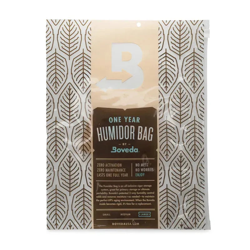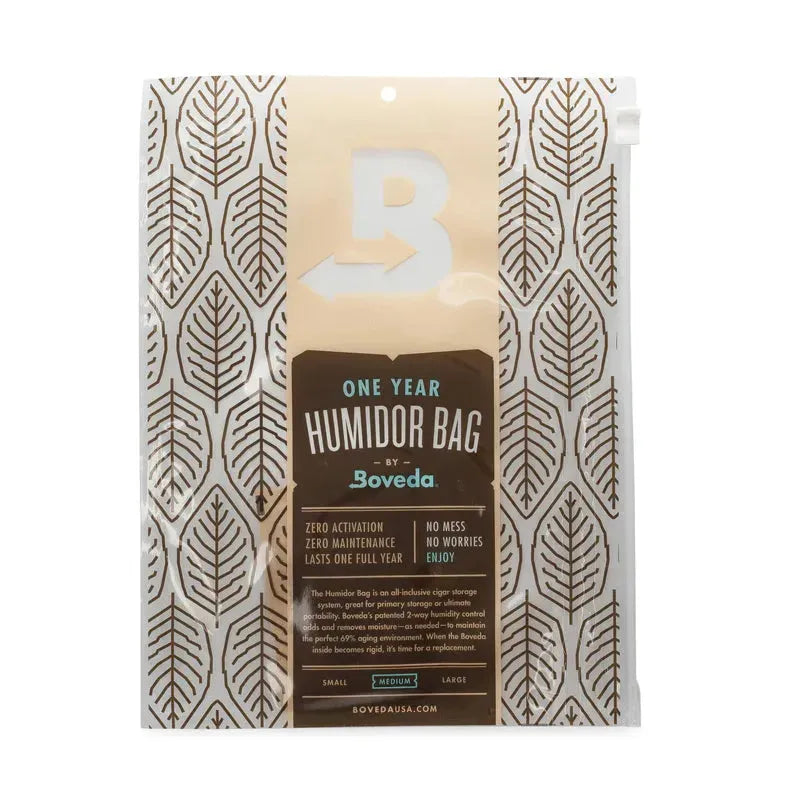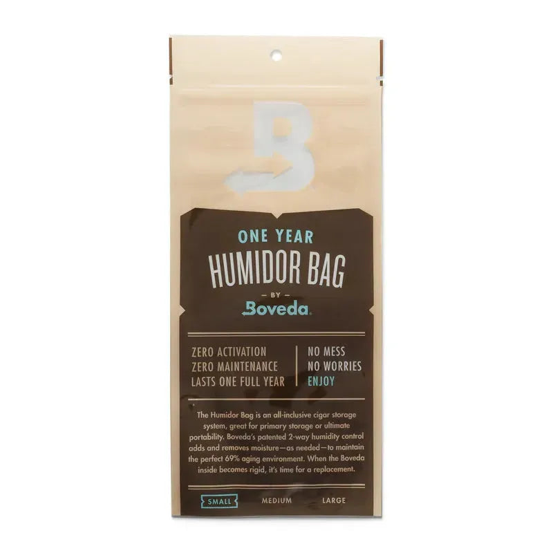 En Boveda Humidorpose kan holde hele livet. Selvom der står "et år" på forsiden, er posen genanvendelig. Det er Boveda inde i humidorposen, der holder op til et år. Efter et år, udskift Boveda med B69. (Størrelse 8 og Størrelse 60 pakker er tilgængelige separat.)