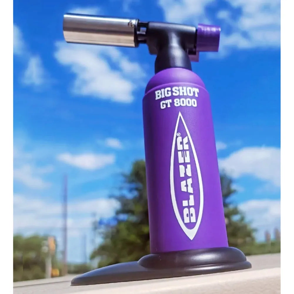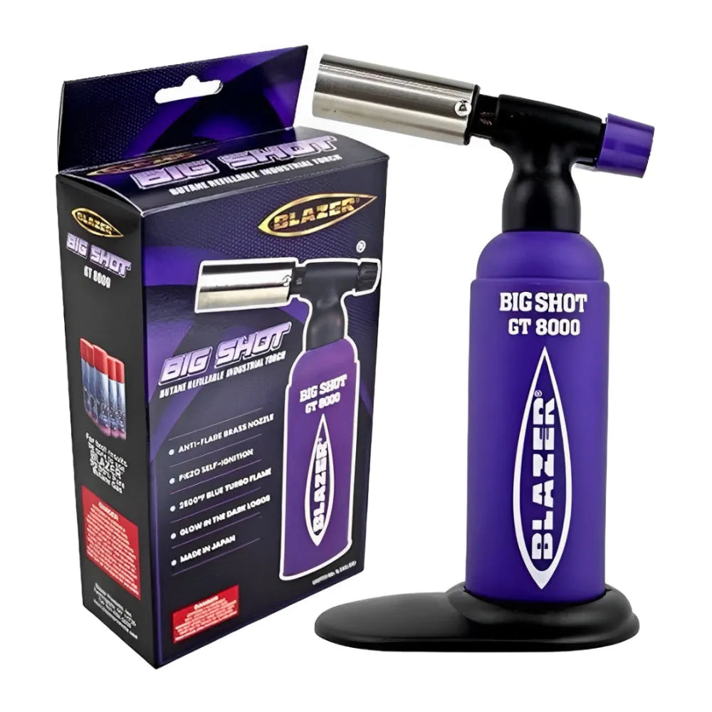 Den kraftfulde Blazer GT 8000 Big Shot er en bærbar anti-flare butan genopfyldelig brænder. Big Shot har en stærk og robust messing flammekontrol. Vend den på hovedet uden at bekymre dig om flammeudblæsning. Piezo krystal øjeblikkelig tænding og avanceret ingeniørkunst kombineres til et af de mest kraftfulde og mindste værktøjer, du nogensinde vil bruge. Med over 35 minutters høj kvalitet 2500ºF brændetid, vil denne fuldstændig bærbare, selvstændige enhed opfylde alle dine lodde- og andre professionelle og industrielle behov. Passer nemt i din værktøjskasse. butanbrænderen er en genopfyldelig, gasbrænder med en messingramme dyse og aftagelig base. Denne fuldstændig bærbare, letvægts butanbrænder vil opfylde alle dine vaping behov og fungerer godt til opvarmning af Ti-Pads og andre koncentrat tilbehør.