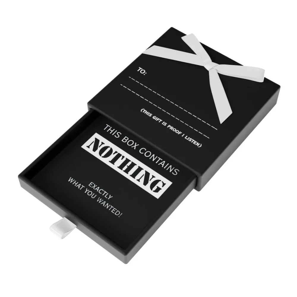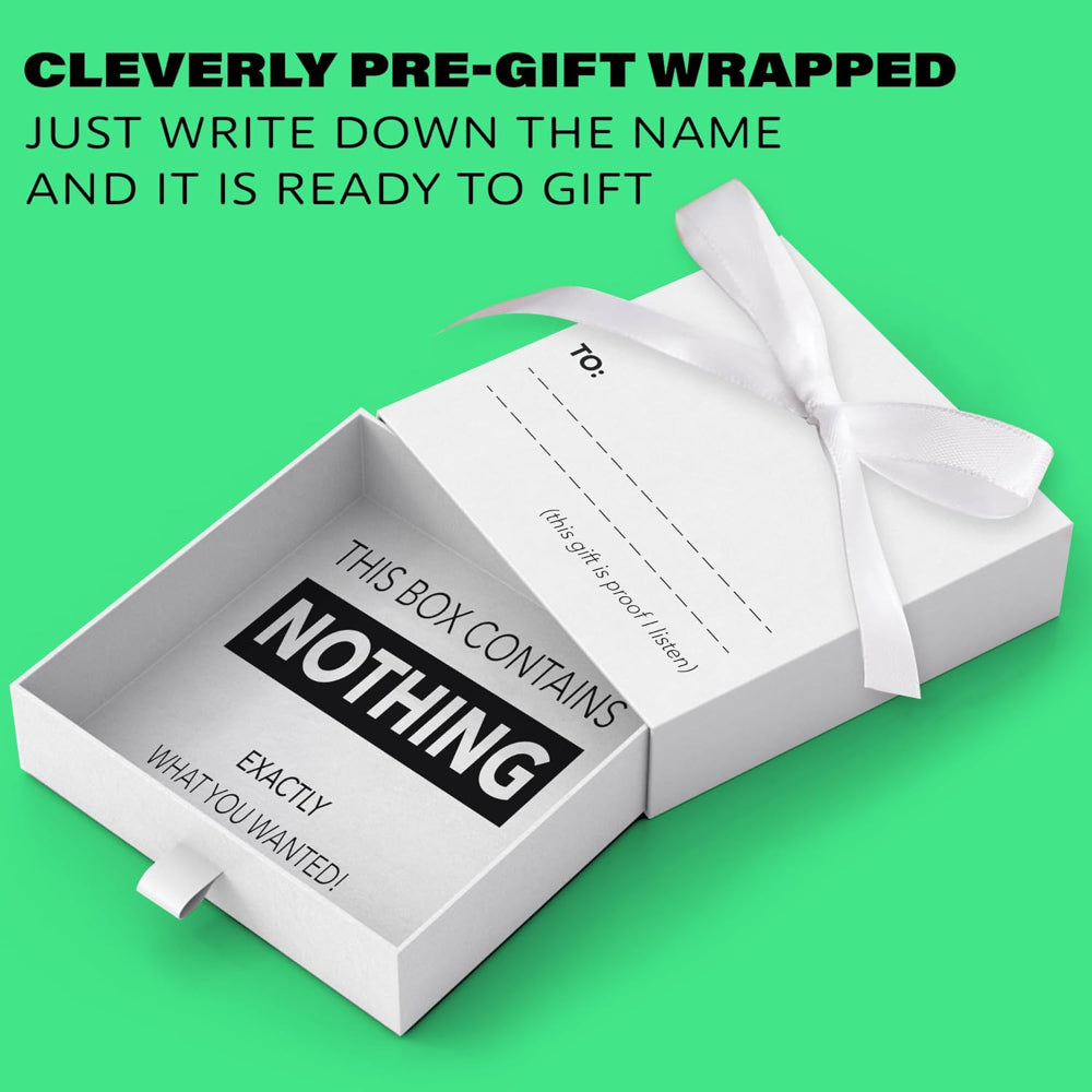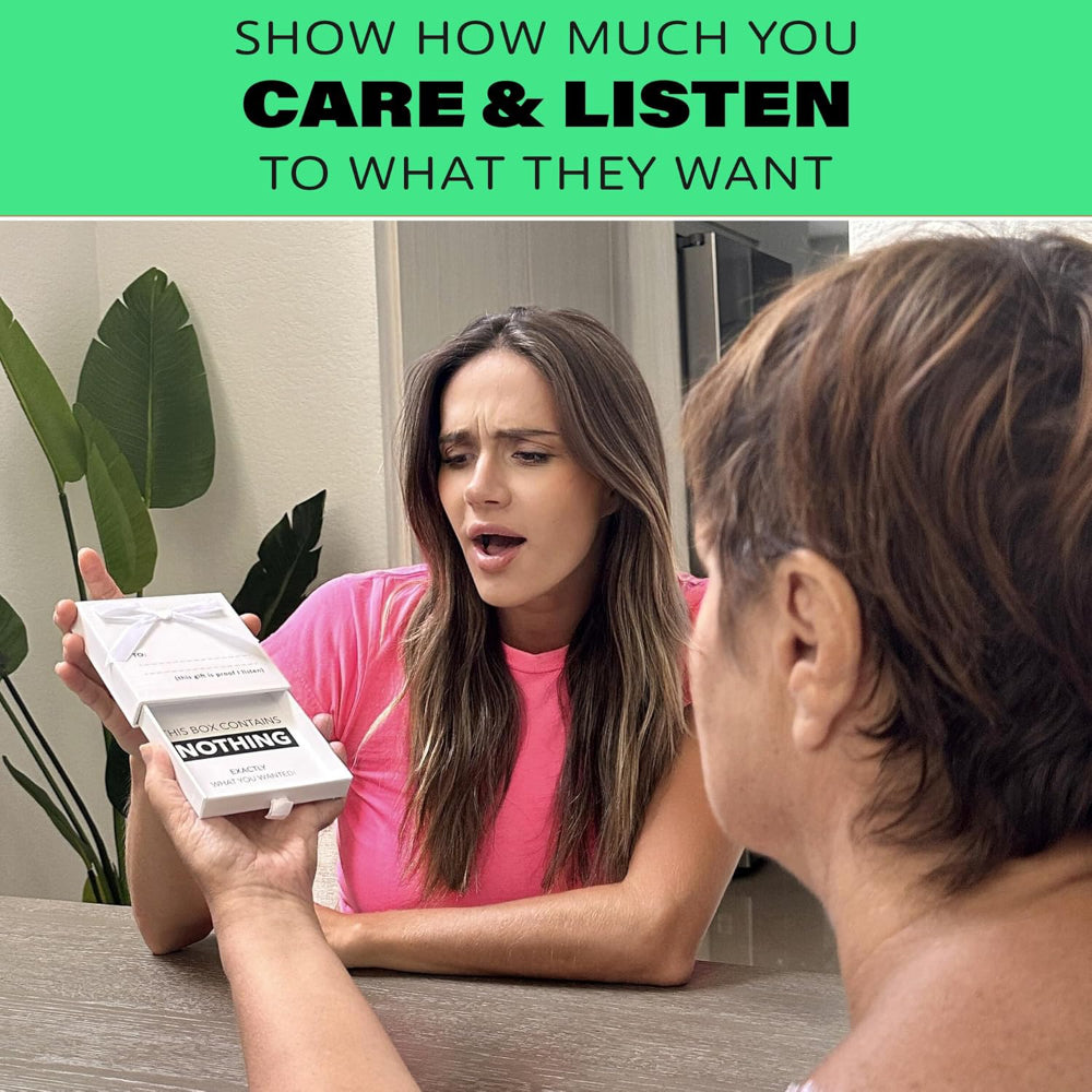 ¡Exactamente lo que pidieron — nada! Este regalo está ingeniosamente disfrazado en una caja de joyería de alta calidad, añadiendo a la sorpresa y el suspenso. Cuando la abran, encontrarán que la caja está vacía, cumpliendo humorísticamente su declaración de "no necesitar nada."