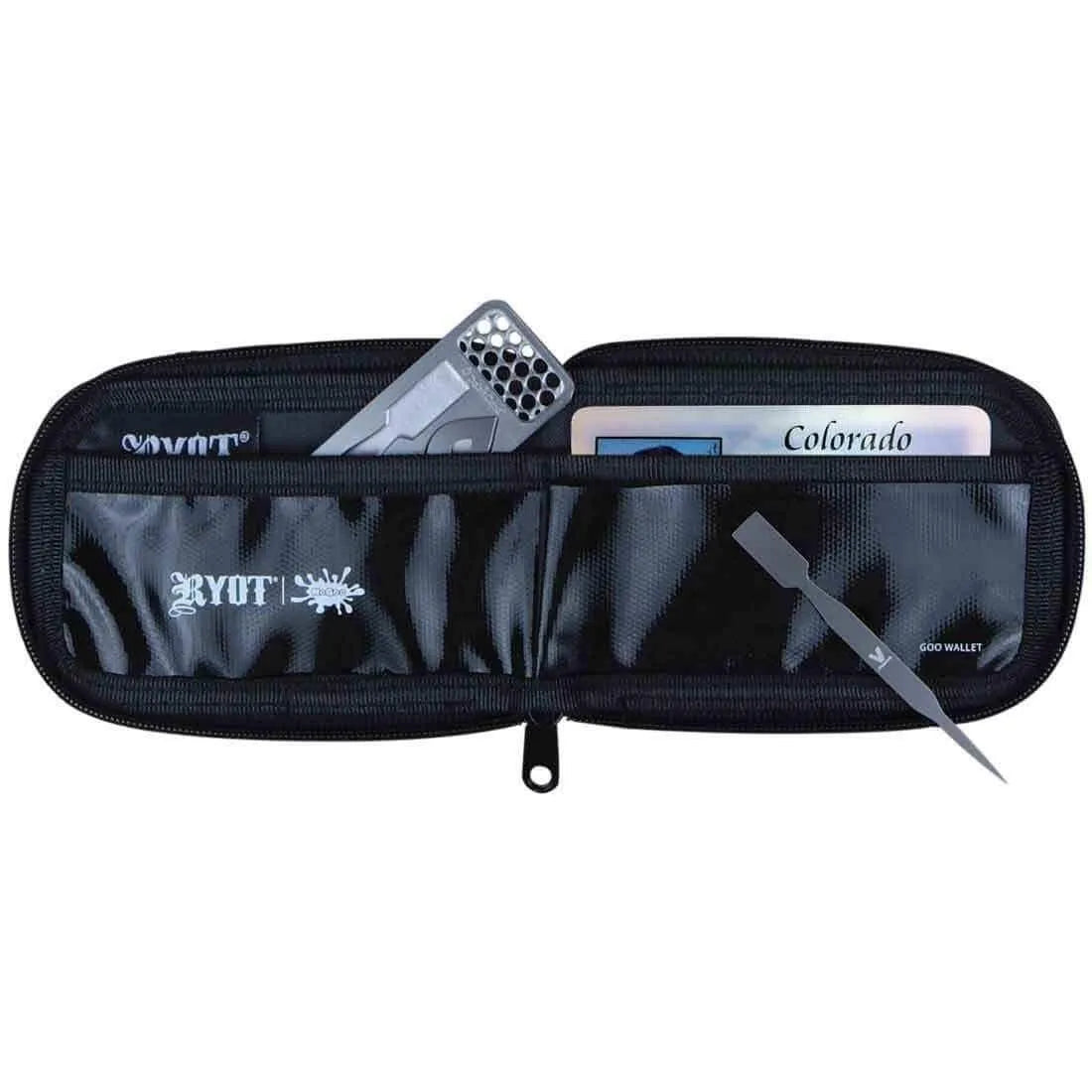 Le RYOT portefeuille SmellSafe GOO comprend un tapis en silicone NoGoo de qualité, durci au platine, ainsi qu'une poche de rangement pour la cire avec suffisamment d'espace pour votre argent et vos cartes. Ces portefeuilles sont disponibles en Noir et Olive.