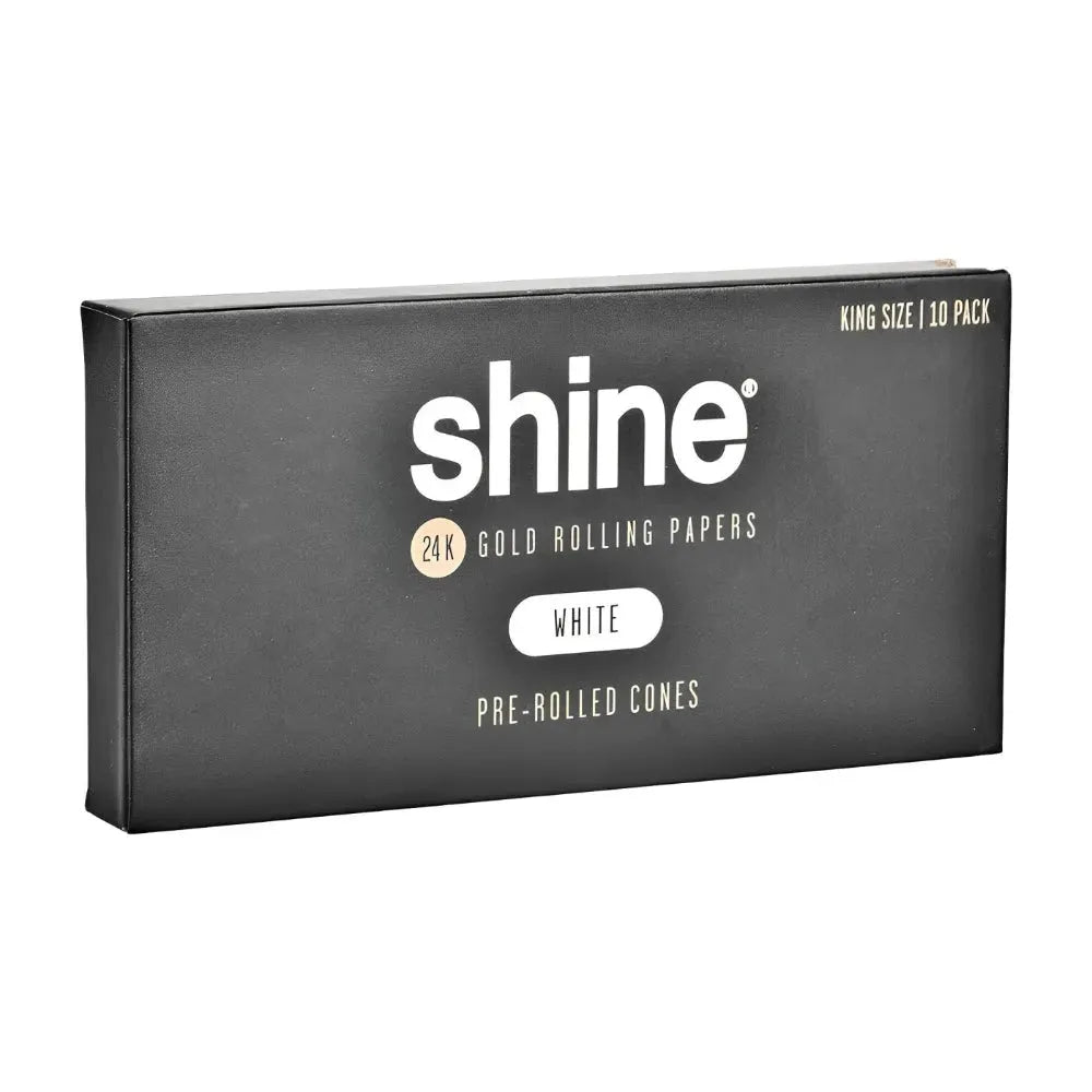 Bemutatjuk legújabb remekművünket, Shine 'White,' a kifinomultság és elegancia megtestesítője a dohányzás élvezetében. 10 king-size előre sodort Cones dobozonként. Rizspapírból készült és 24k ehető arany "Shine" logóval van...