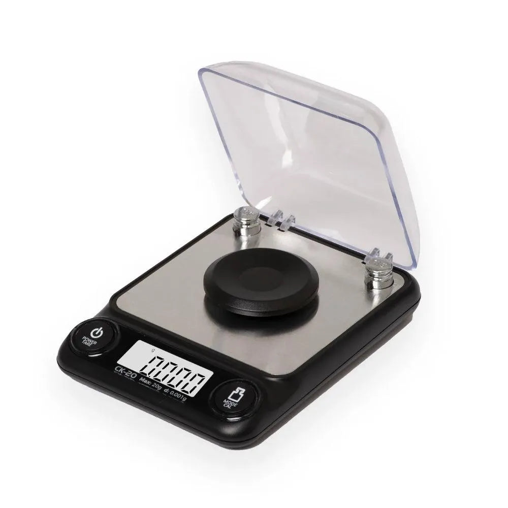 A CK digitális milligramm mérleg kompakt kialakítással rendelkezik, beépített huzatvédővel/fedéllel. A nagy pontosságú érzékelő lehetővé teszi, hogy a mérleg legfeljebb 20 grammot mérjen, 0,001g (1mg) kijelző olvashatósággal. Az eredmények könnyen olvashatók a fehér, háttérvilágítású LCD-n bármilyen fényviszony mellett. A beépített túlterhelés elleni védelem segít megelőzni a mérleg károsodását. Egyéb funkciók közé tartozik a programozható automatikus kikapcsolás 30/60/90/180 másodperc inaktivitás után, Tare/Zero funkció a tartály vagy bővítő tálca súlyának levonásához, és az egyszerű egyérintéses kalibrálás.