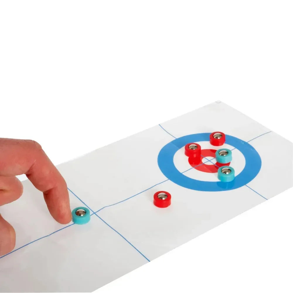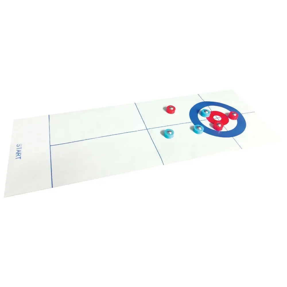 Schuif de stenen naar het doel. Alleen precisie zal je helpen je tegenstander te verslaan! Inhoud van de doos: 1 curlingbaan, 3 blauwe stenen, 3 rode stenen.