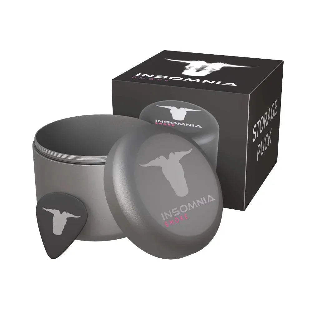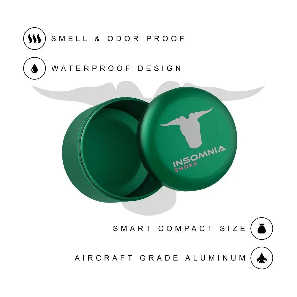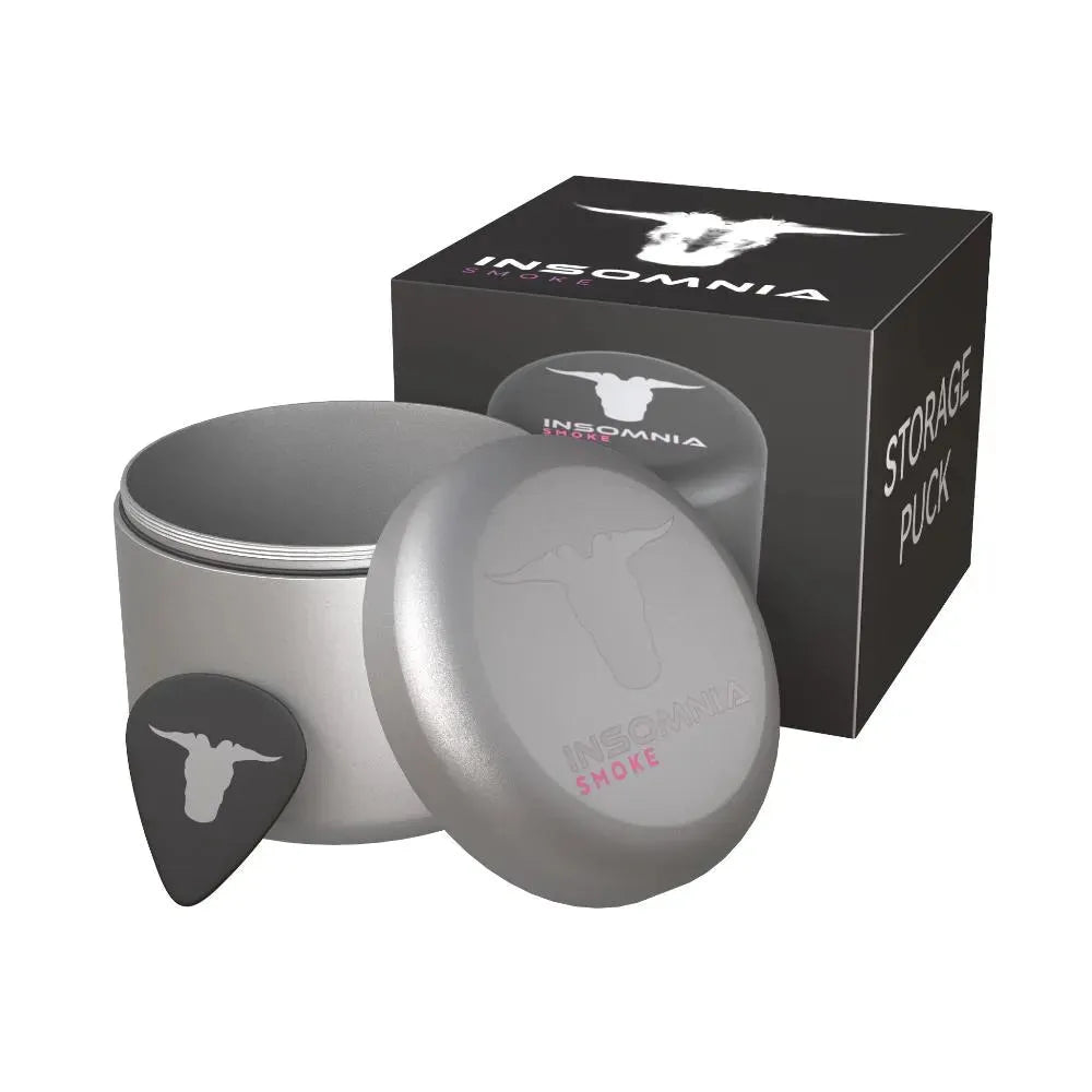 Introduserer Insomnia Smoke Kompakt Oppbevaring Puck - en premium, luktfri og vanntett metallboks designet for diskret og sikker oppbevaring av urter, krydder, piller og andre småting. Laget av høykvalitets anodisert aluminium, sikrer denne slanke og holdbare oppbevaringskrukken at innholdet ditt forblir friskt og beskyttet, enten hjemme eller på farten.