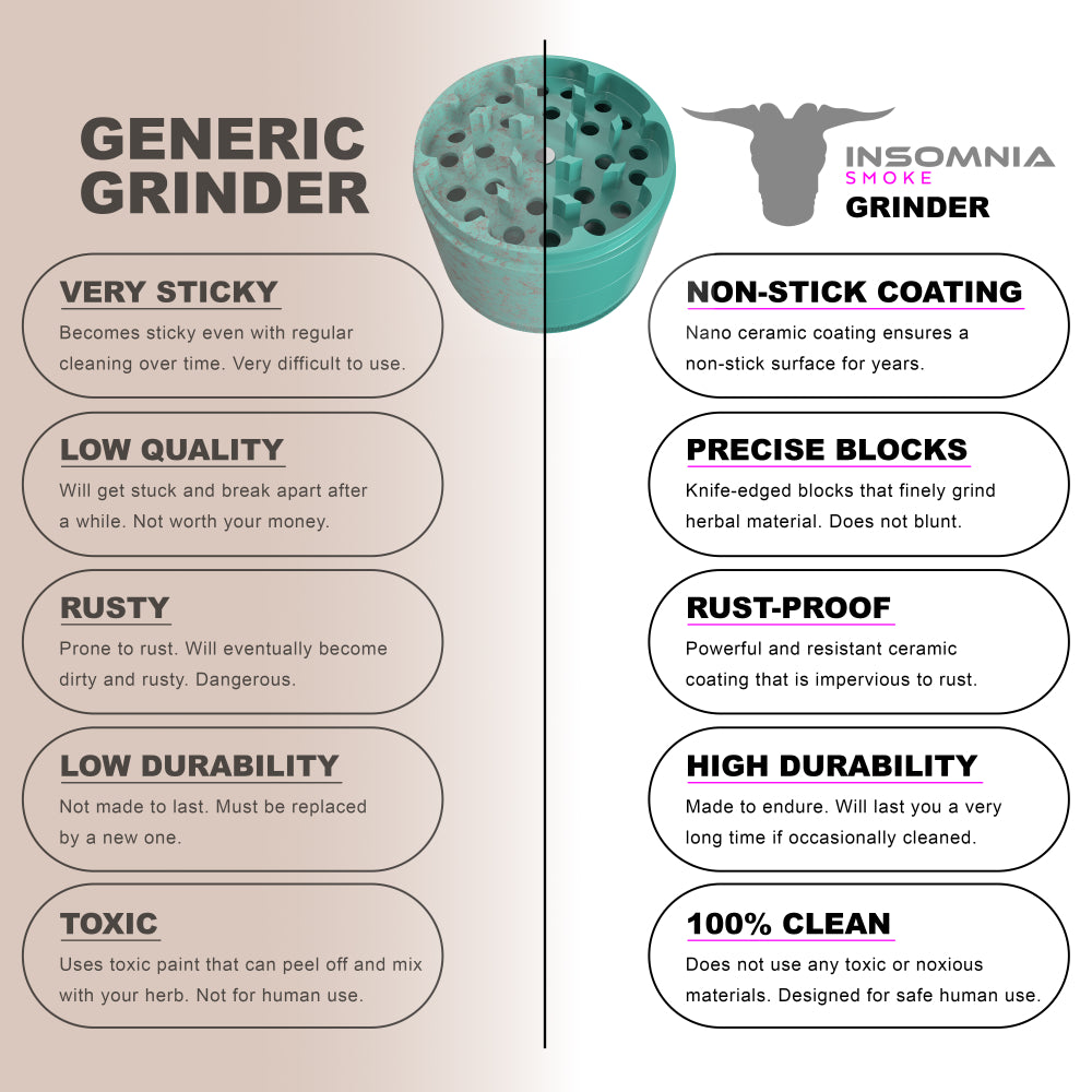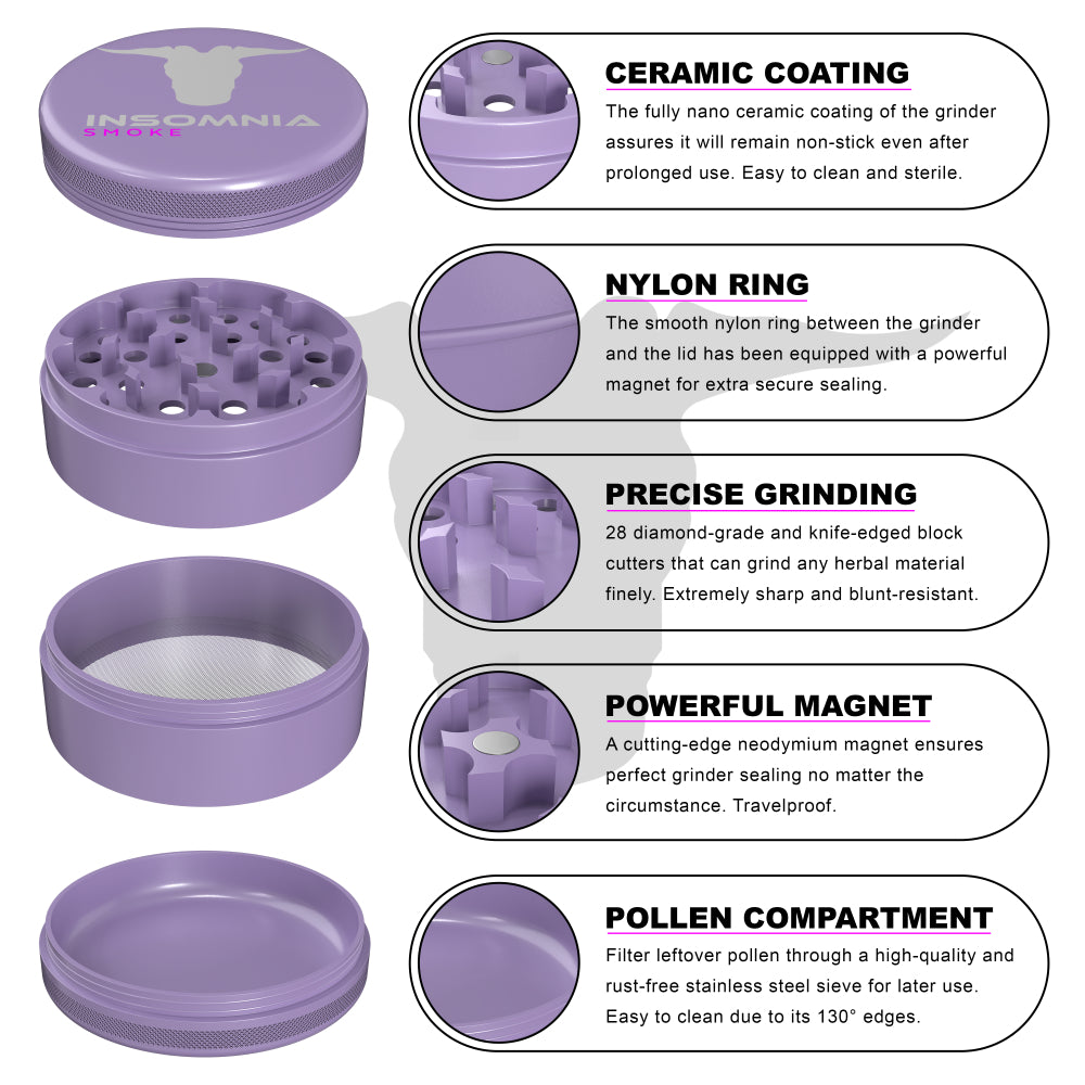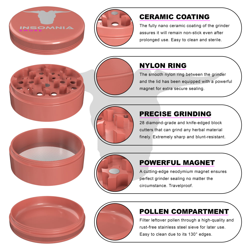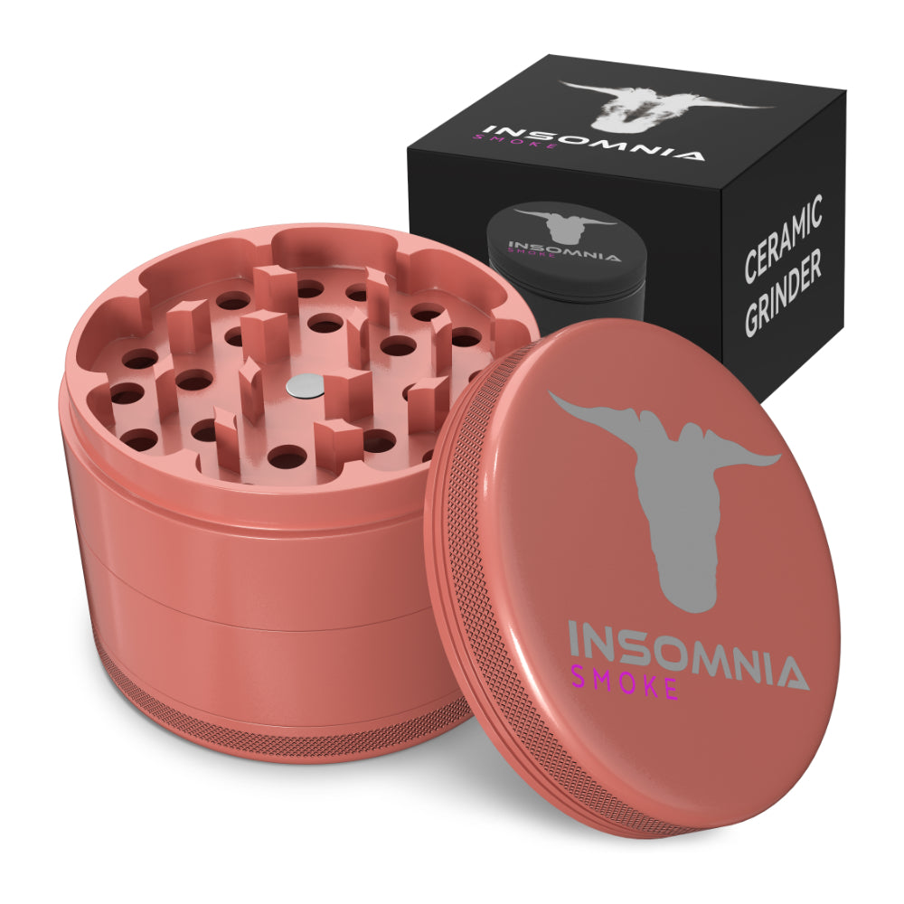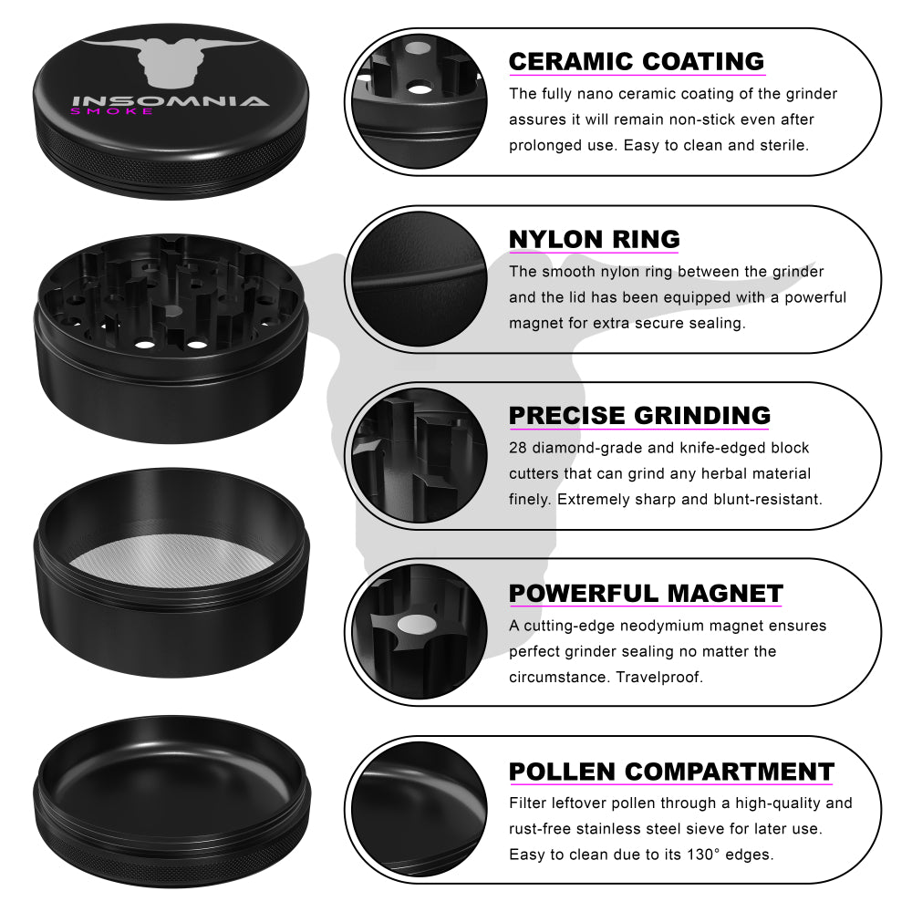 The Insomnia Smoke Herb Grinder features a non-stick ceramic coating and precision-engineered lion teeth, offering a smoother, cleaner grind than standard models. Its food-safe materials and durable aluminum body ensure long-term reliability and consistent performance.