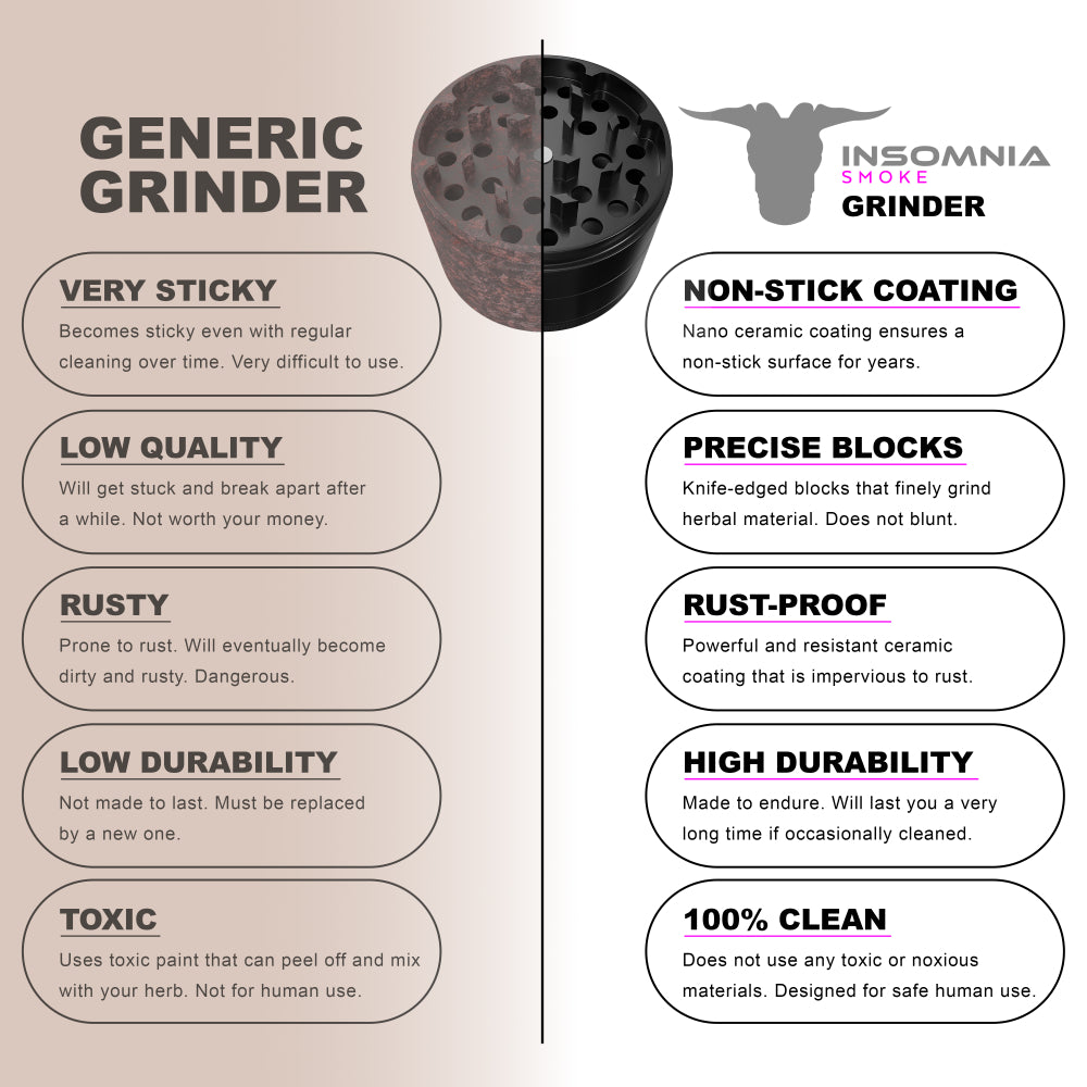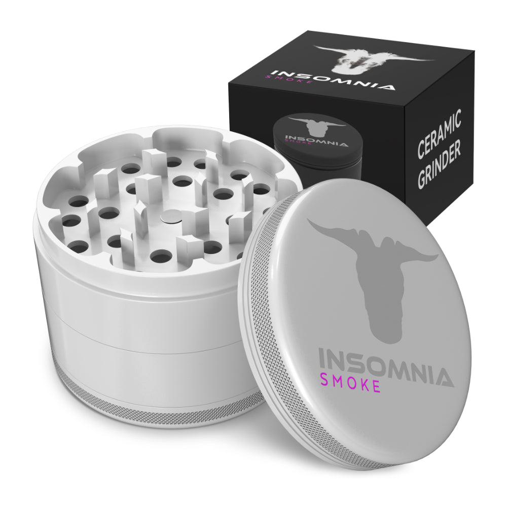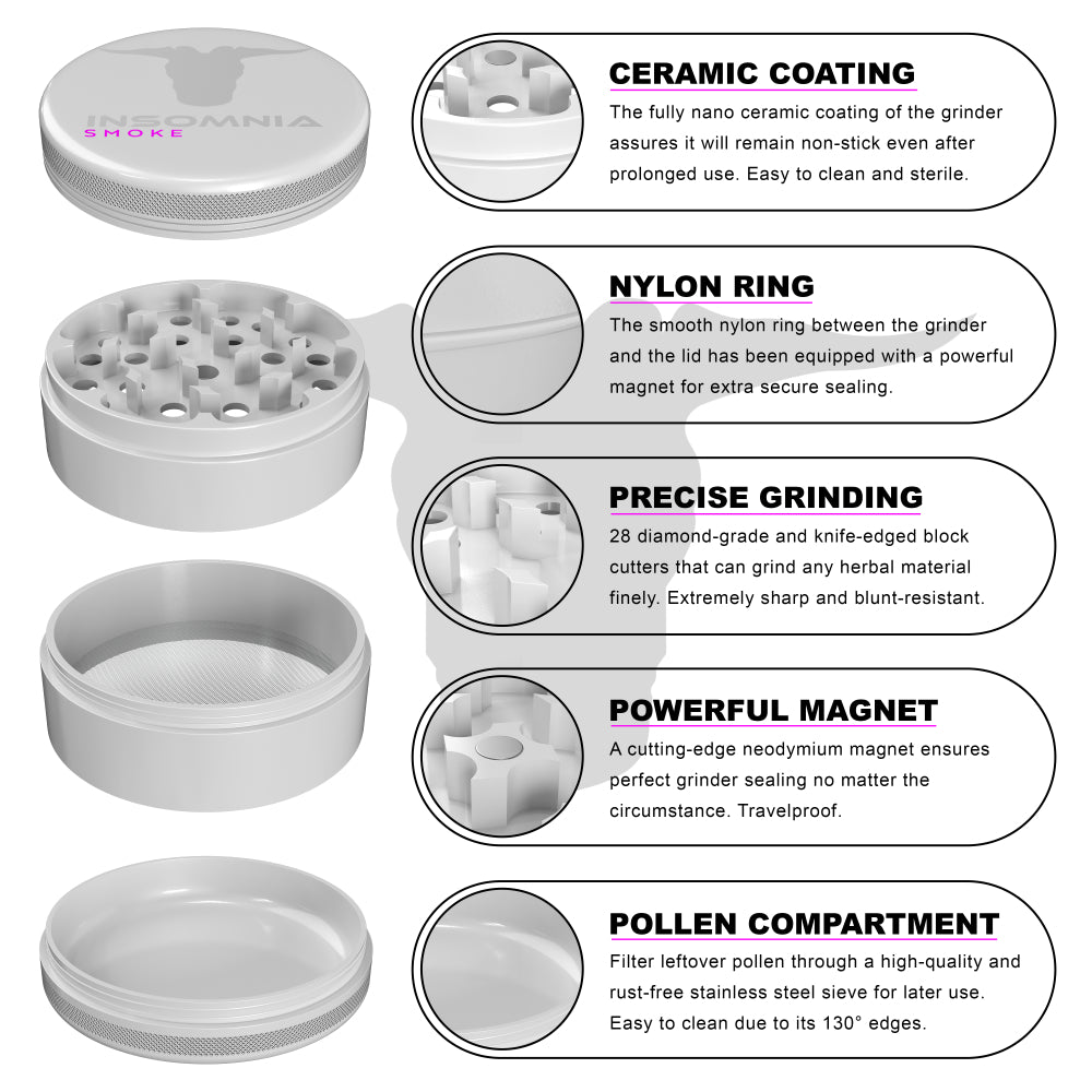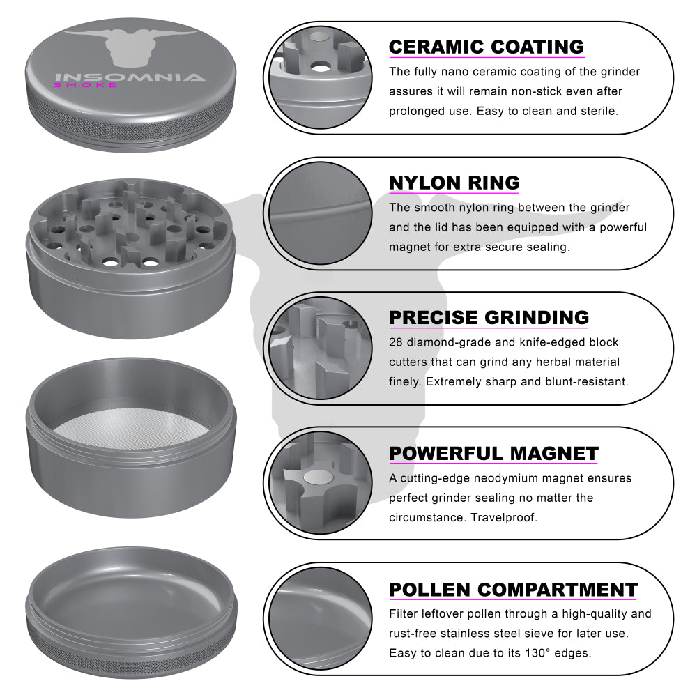 The Insomnia Smoke Herb Grinder features a non-stick ceramic coating and precision-engineered lion teeth, offering a smoother, cleaner grind than standard models. Its food-safe materials and durable aluminum body ensure long-term reliability and consistent performance.