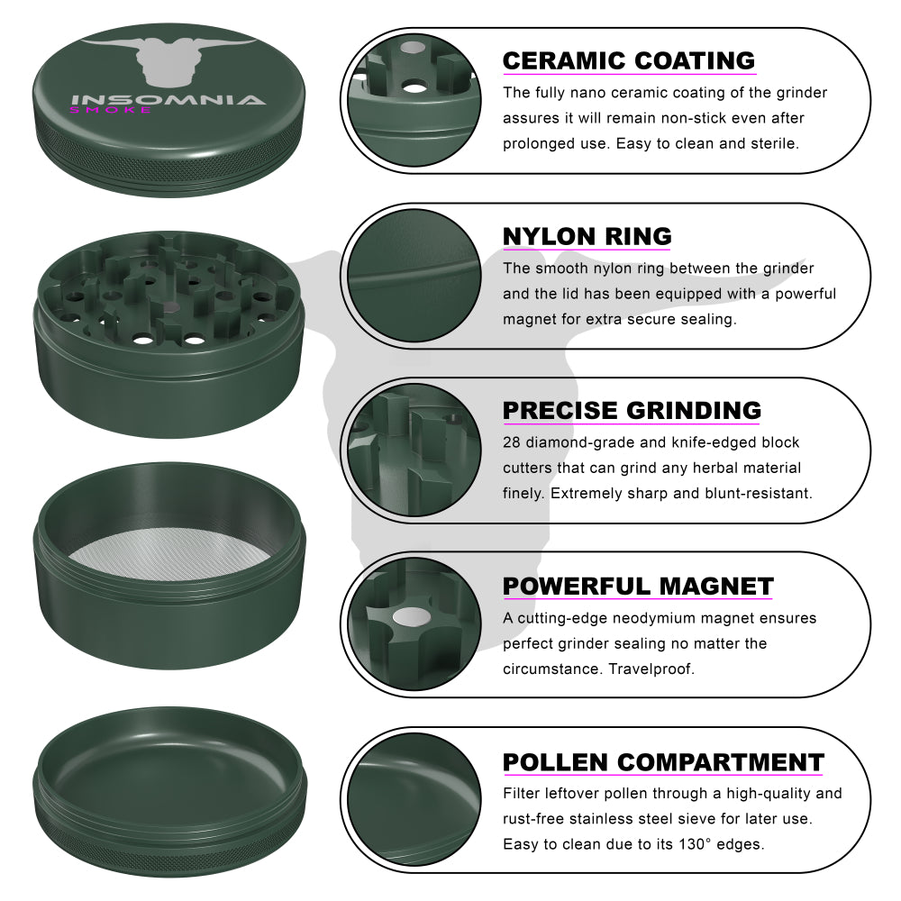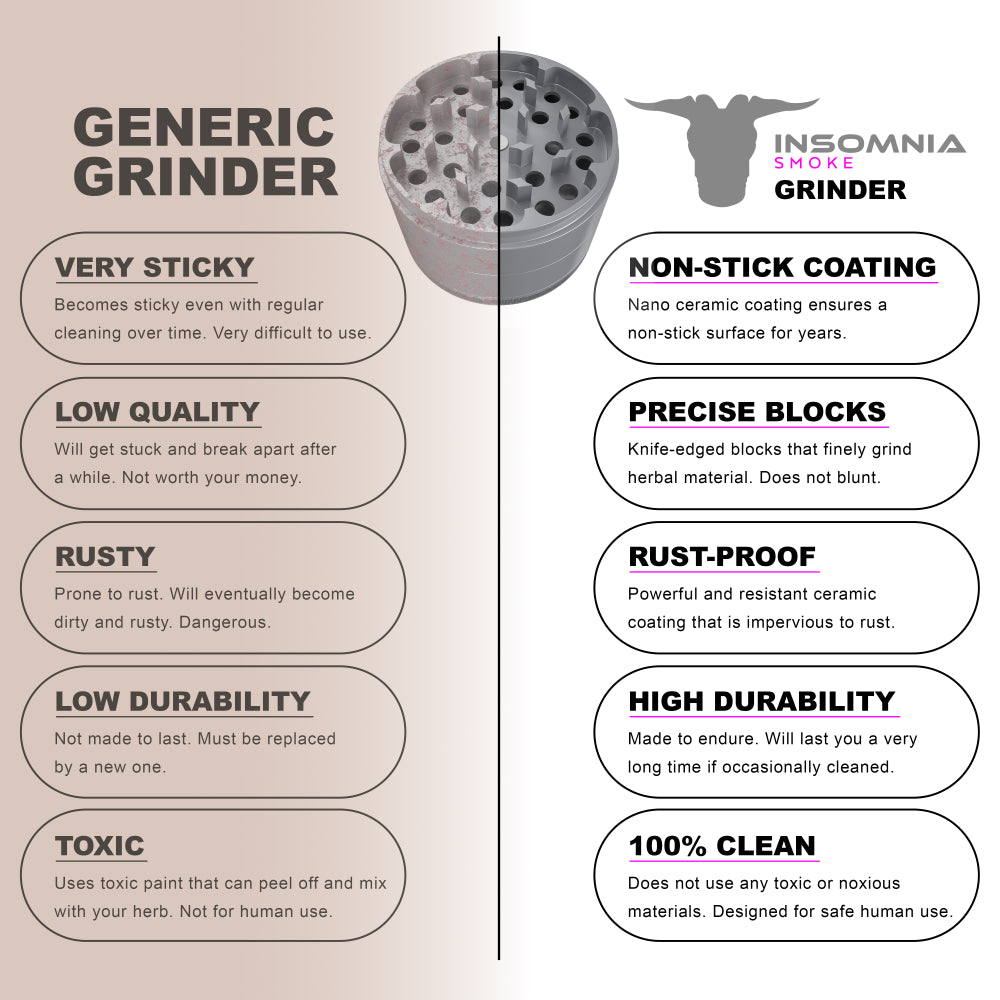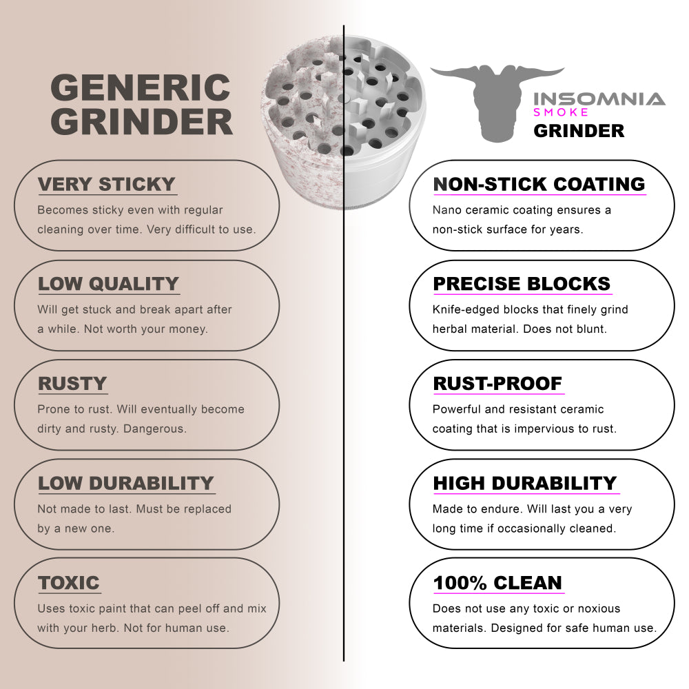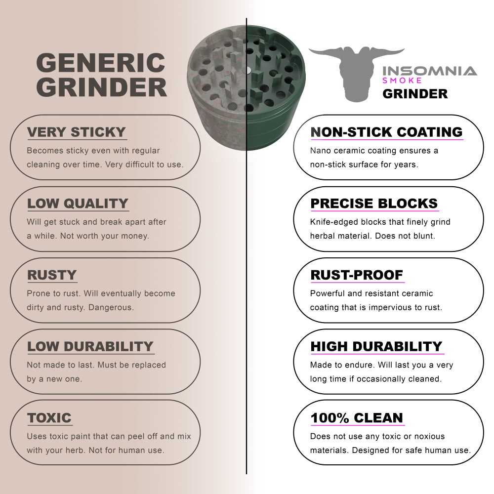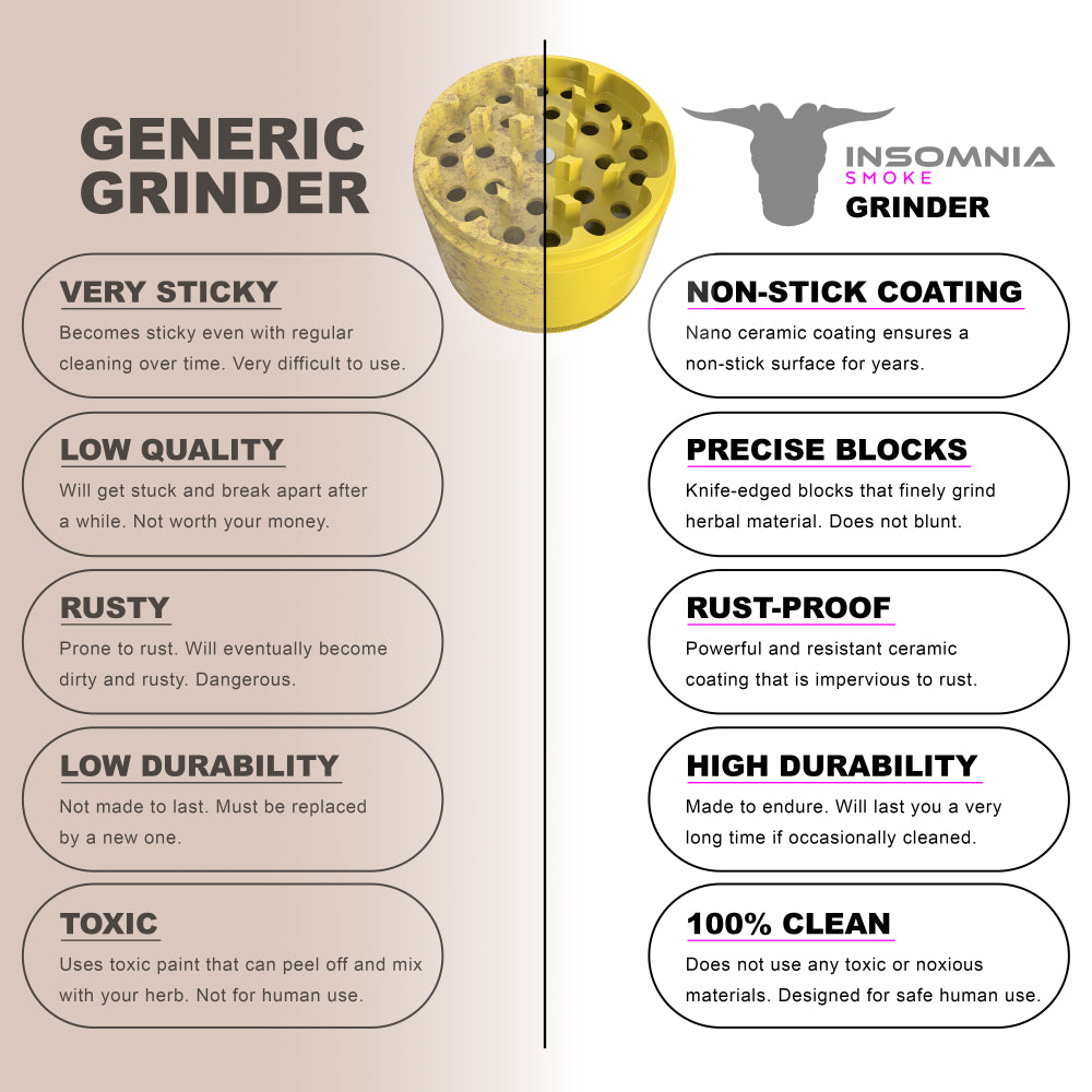 The Insomnia Smoke Herb Grinder features a non-stick ceramic coating and precision-engineered lion teeth, offering a smoother, cleaner grind than standard models. Its food-safe materials and durable aluminum body ensure long-term reliability and consistent performance.