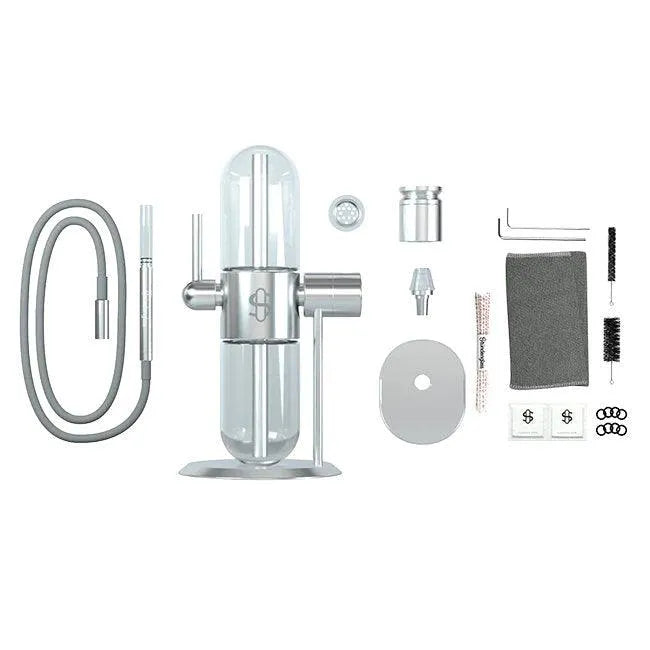 Stündenglass Gravity Vannpipe Polished Silver leveres som et komplett sett som inkluderer et aluminium Vannpipe bollesett og en glassbolle for en konvensjonell røykeopplevelse. Enheten kan også brukes med hvilken som helst Vaporizer med en 14 mm hann Joint. Den medfølgende 90 cm siliKjegle slangen gir brukeren god plass til å nyte røyken i en komfortabel posisjon. Et annet alternativ er kontaktløs inhalering gjennom det 45° justerbare munnstykket.