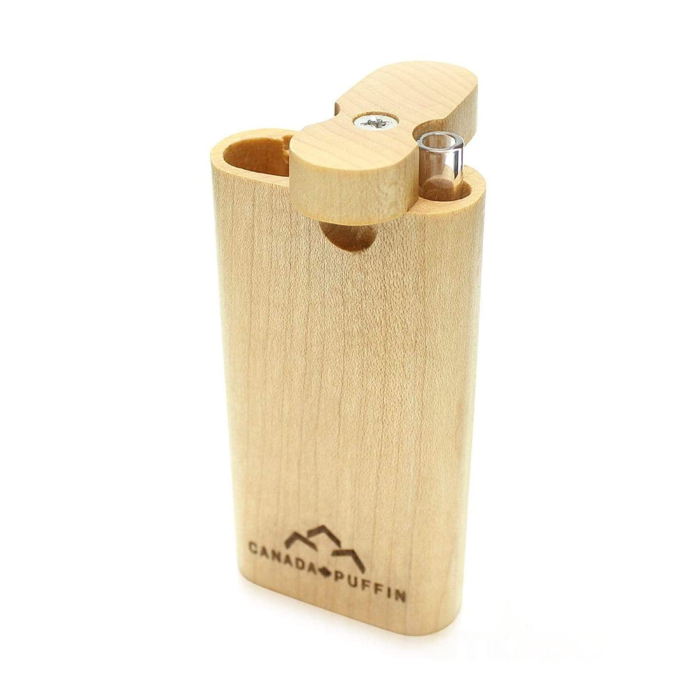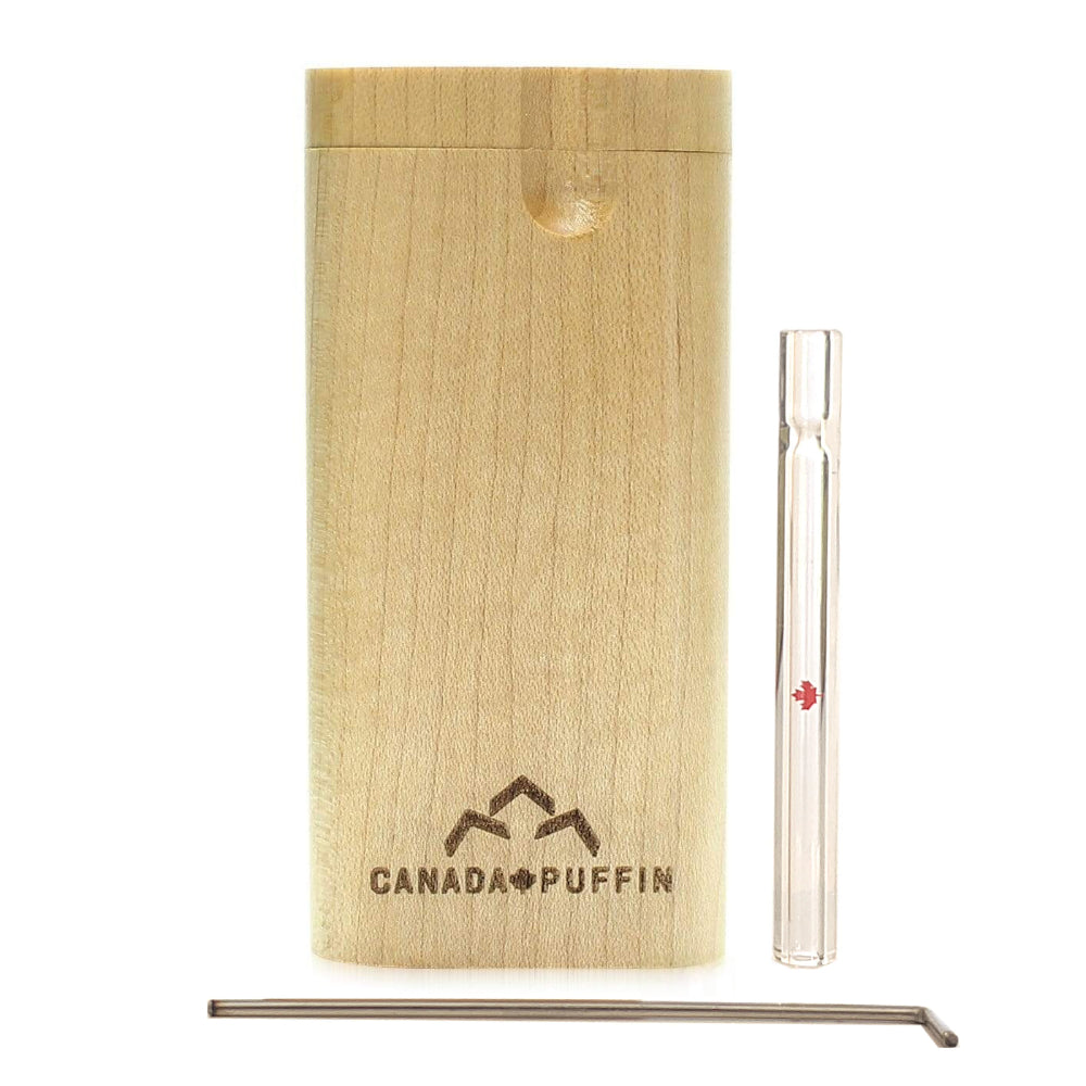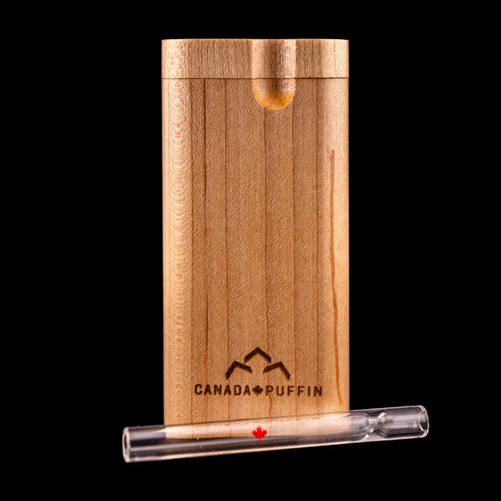 The Canada Puffin Banff Dugout and One Hitter is a premium, portable smoking accessory that combines a handcrafted Canadian Maple wood case with a high-quality, heat-resistant borosilicate glass one hitter pipe. Designed for style, durability, and convenience.