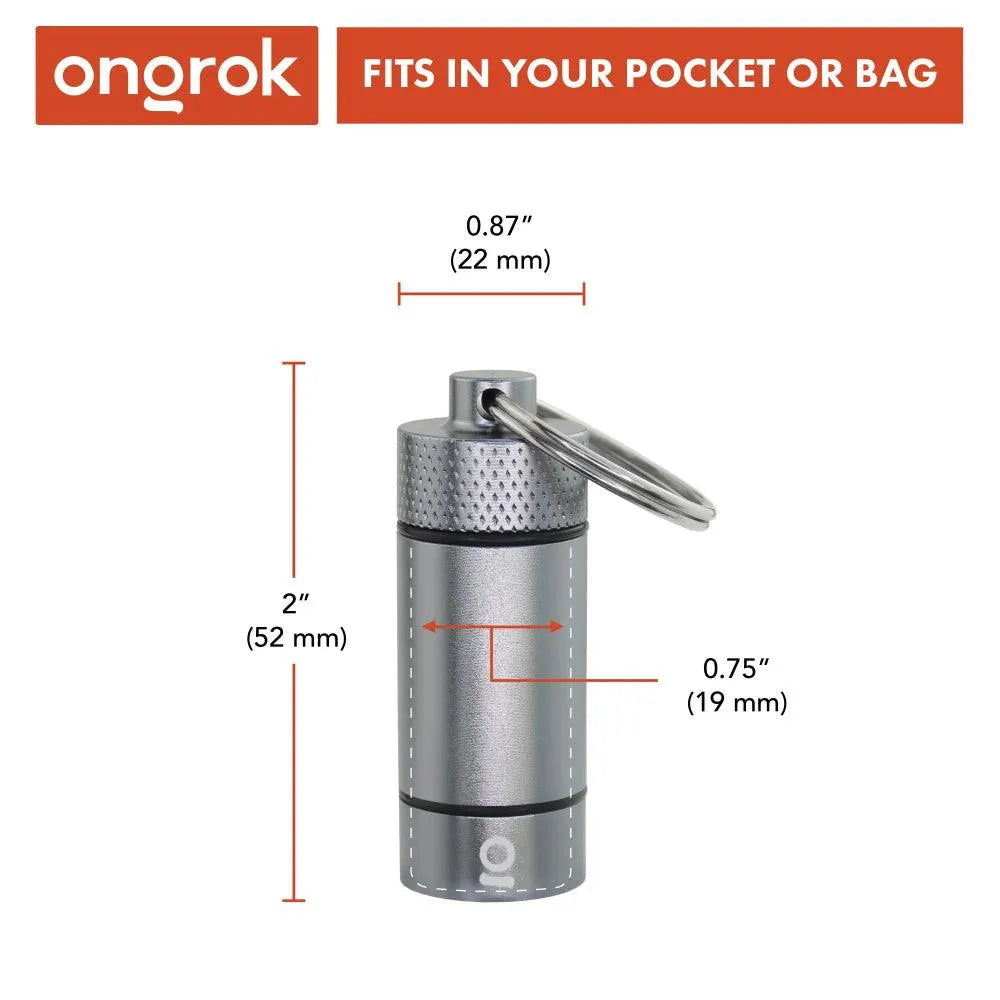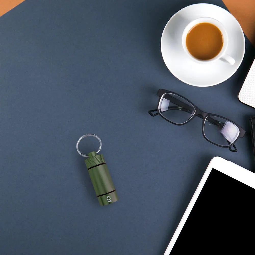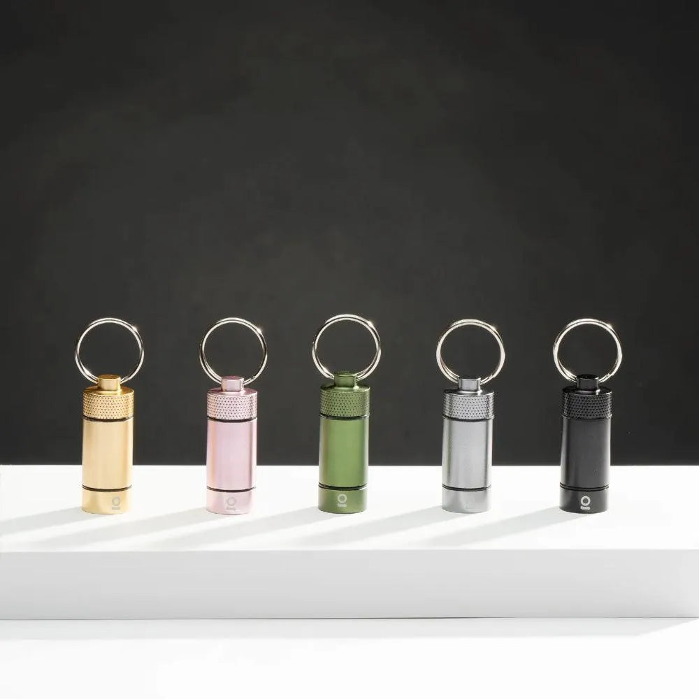 Denne nøkkelringen er vårt minste oppbevaringsrør og et flott tilbehør å ha med seg på farten! Disse små metallrørene holder gjenstander trygt gjemt bort, er også bærbare og passer inn i lommene eller vevingen på våre luktfrie, karbonforede etuier, lommebøker og poser!