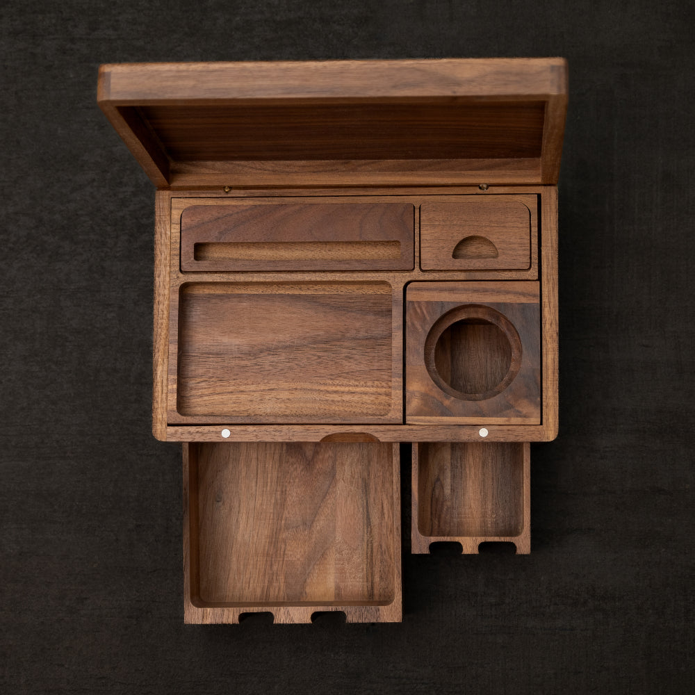 Kompakt, men komplett, denne stash-boksen leverer effektivitet og stil i et slankt tre-design - ideell for hjemmet, reise eller som gave.