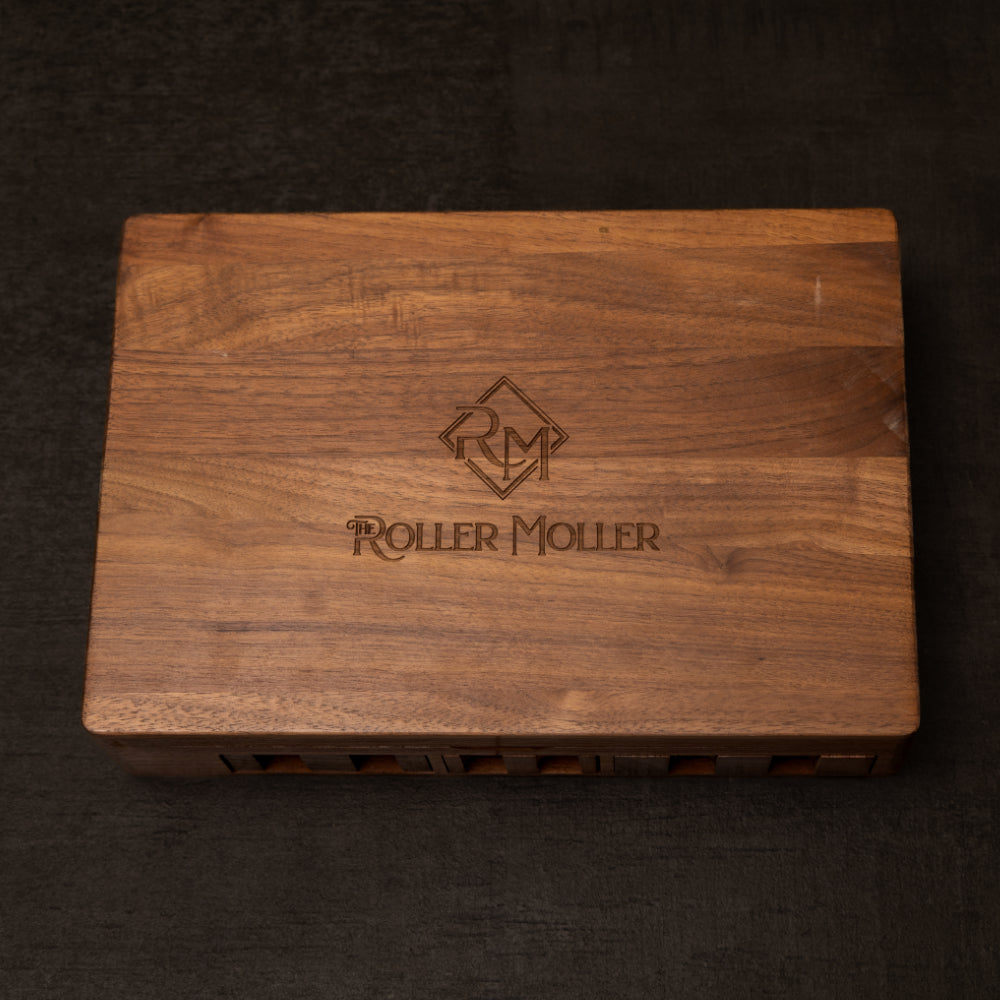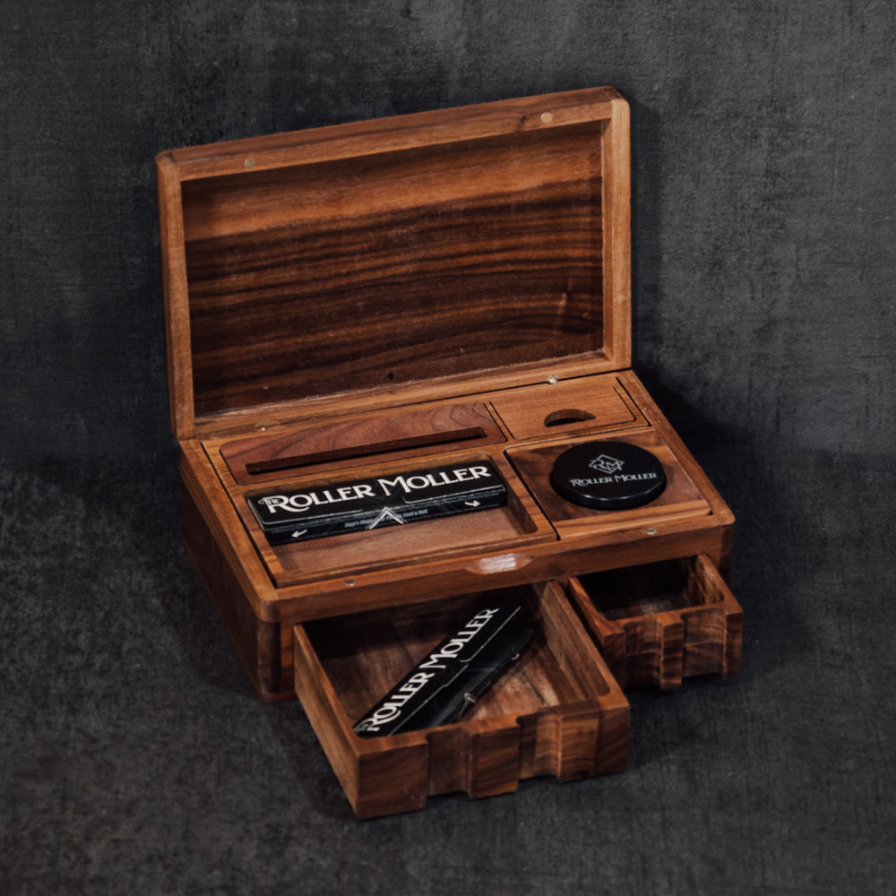 The Roller Moller Wooden Stash Box - Compact Edition er et premium sett for røykere laget for de som setter pris på både kvalitet og bekvemmelighet. Designet med bærbarhet og eleganse i tankene, holder denne håndlagde treboksen alle dine rulle-essensialer i ett elegant, organisert rom - ideell for bruk hjemme eller på farten.