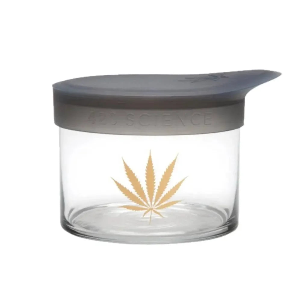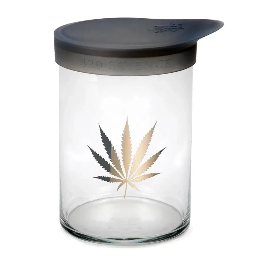 O 420 Science Frasco de Boca Larga adornado com um decalque de Folha de Ouro verdadeiro está disponível em 3 tamanhos diferentes - pequeno, médio e grande. Feito de vidro soprado à máquina nos EUA e vem completo com uma tampa de siliCone à prova de cheiro.
