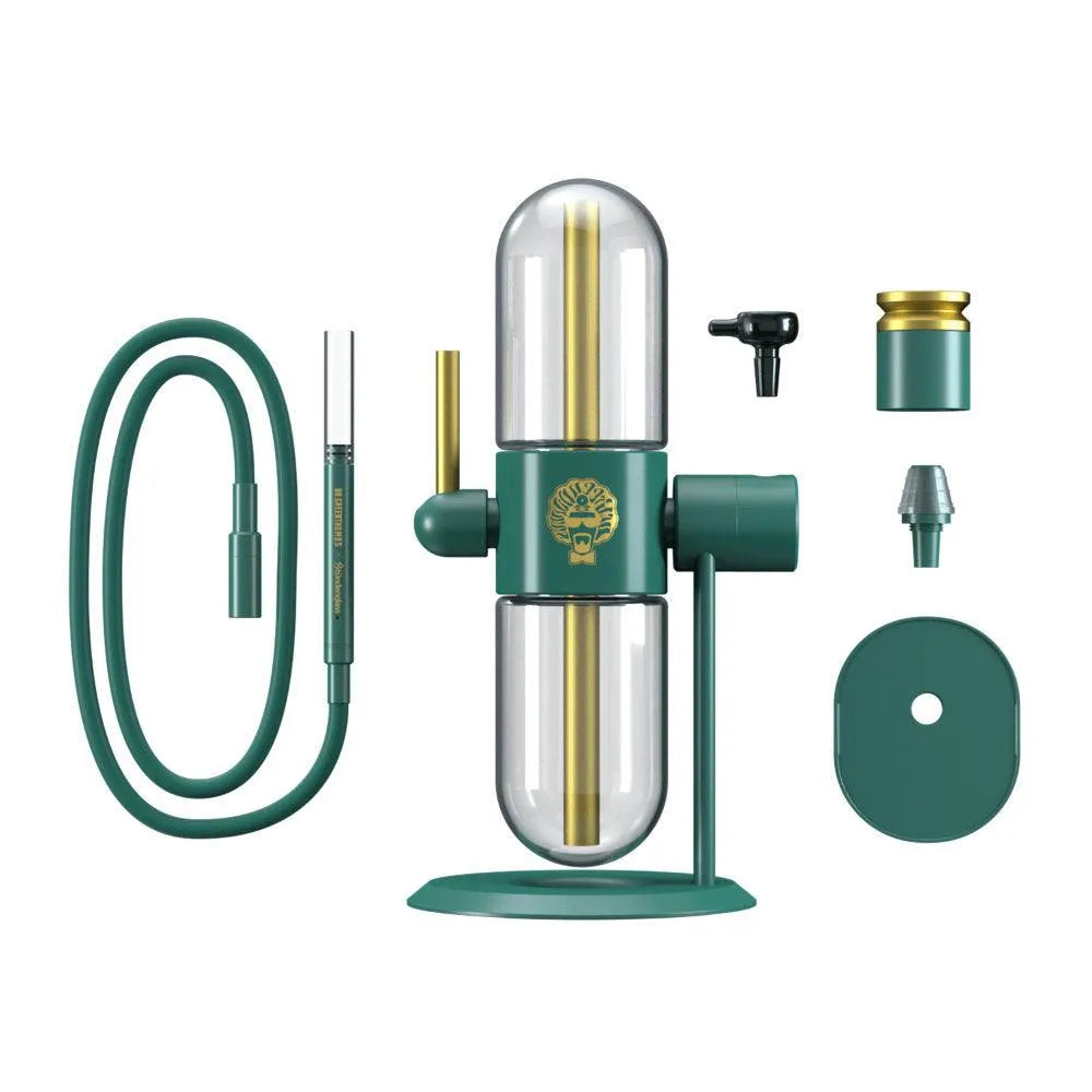 Dr Greenthumb's x Stündenglass Gravity Кальян поставляется в комплекте со всеми аксессуарами, включая алюминиевый Кальян набор чаш и стеклянную чашу для традиционного курения. Устройство также может подключаться к любому Испаритель с 14 мм мужским Косяк. В комплект входит 90 см силиконовыйКонус шланг, который дает пользователю достаточно места, чтобы насладиться дымом в удобной позе. Другой вариант — бесконтактное вдыхание через регулируемый на 45° мундштук.